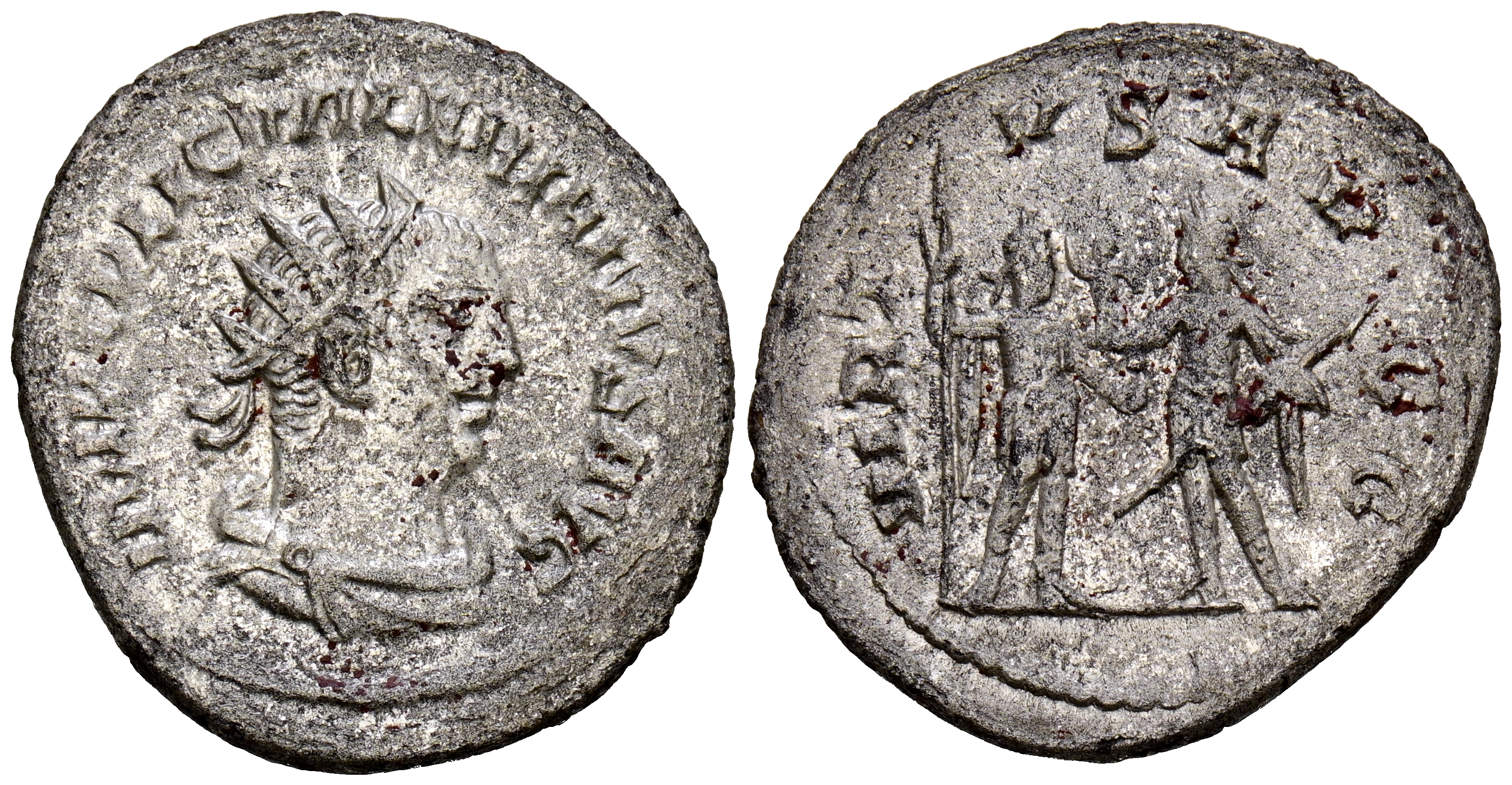 VALERIANO I. Antoniniano. (Ve. 3,58g/24mm). 256-260 d.C. Samosata. (RIC 293). Anv: Busto radiado y drapeado de Valeriano I a derecha, alrededor leyenda: IMP C P LIC VALERIANVS AVG. Rev: Valeriano I y Galieno enfrentados, entre ellos altar y ambos con cetros con águilas, alrededor leyenda: VIRTVS AVGG. MBC.