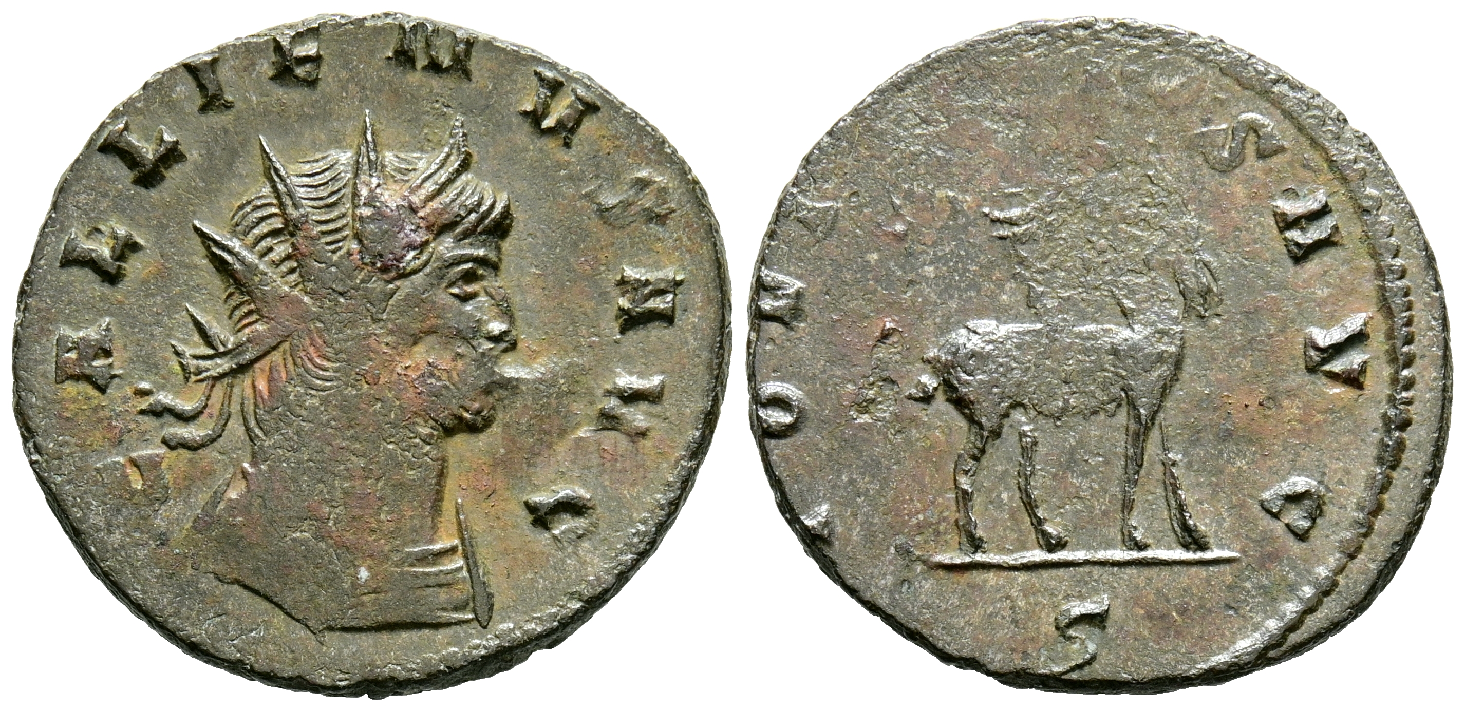GALIENO. Antoniniano. (Ae. 2,83g/20mm). 267-268 d.C. Roma. (RIC 207c). Anv: Busto radiado y con coraza de Galieno a derecha, alrededor leyenda: GALLIENVS AVG. Rev: Cabra a derecha, en exergo: S, alrededor leyenda: IOVI CONS AVG. MBC+. Vano de acuñación.