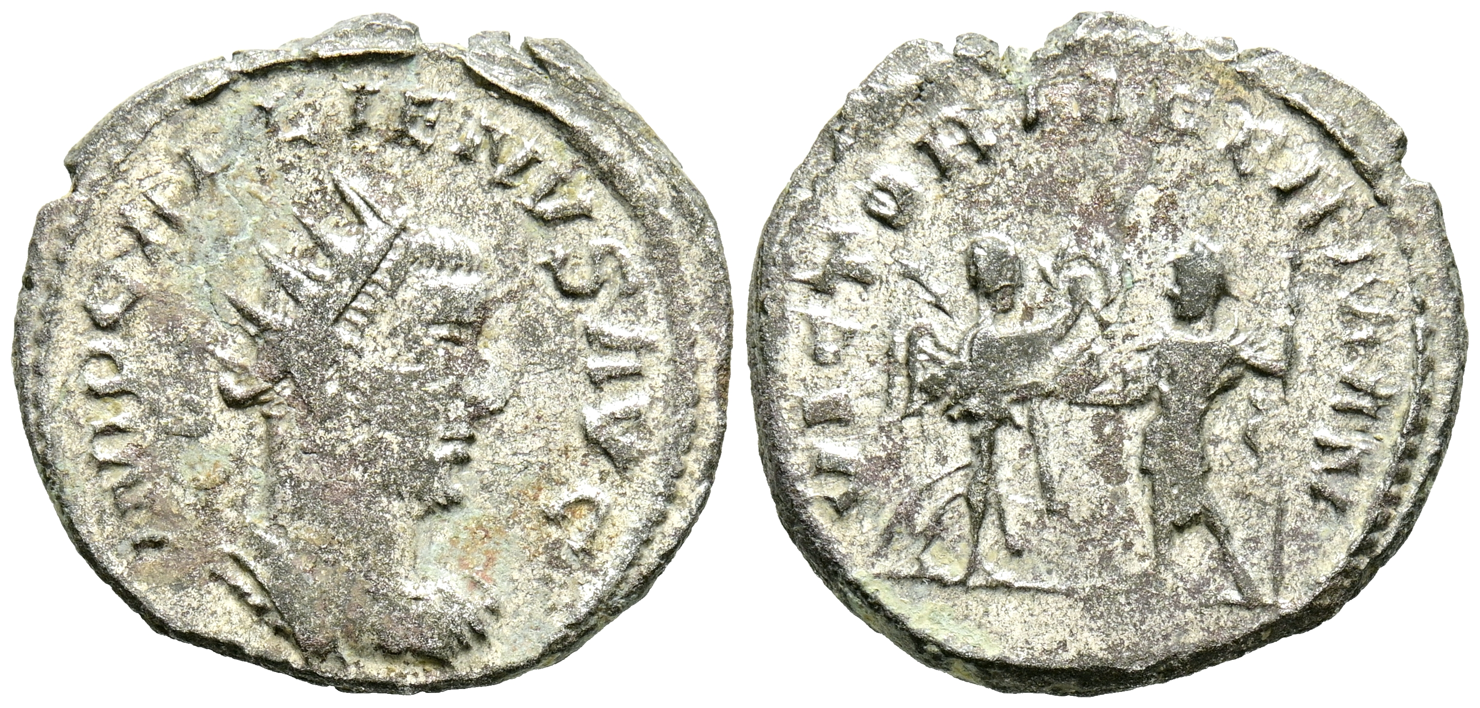 GALIENO. Antoniniano. (Ae. 3,95g/21mm). 256-257 d.C. Antioquía. (RIC-452; MIR-1603b). Anv: Busto radiado y con coraza a la derecha de Galieno, alrededor leyenda: IMP GALLIENVS AVG. Rev: Galieno estante a la izquierda portando globo y cetro y recibiendo corona de laurel de una Victoria estante a la derecha, alrededoor leyenda: VICTORIA GERMAN. MBC. Restos de plateado original. Escasa.