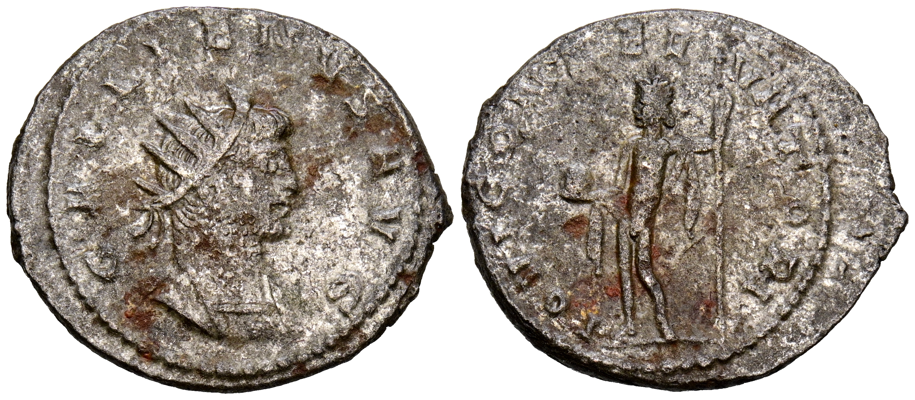 GALIENO. Antoniniano. (Ar. 3,41g/20mm). 266-267 d.C. Antioquía. (RIC 641). Anv: Busto radiado y drapeado de Galieno a derecha, alrededor leyenda: GALLIENVS AVG. Rev: Júpiter estante a izquierda portando cetro y globo, alrededor leyenda: IOVI CONSERVATORI. MBC-.