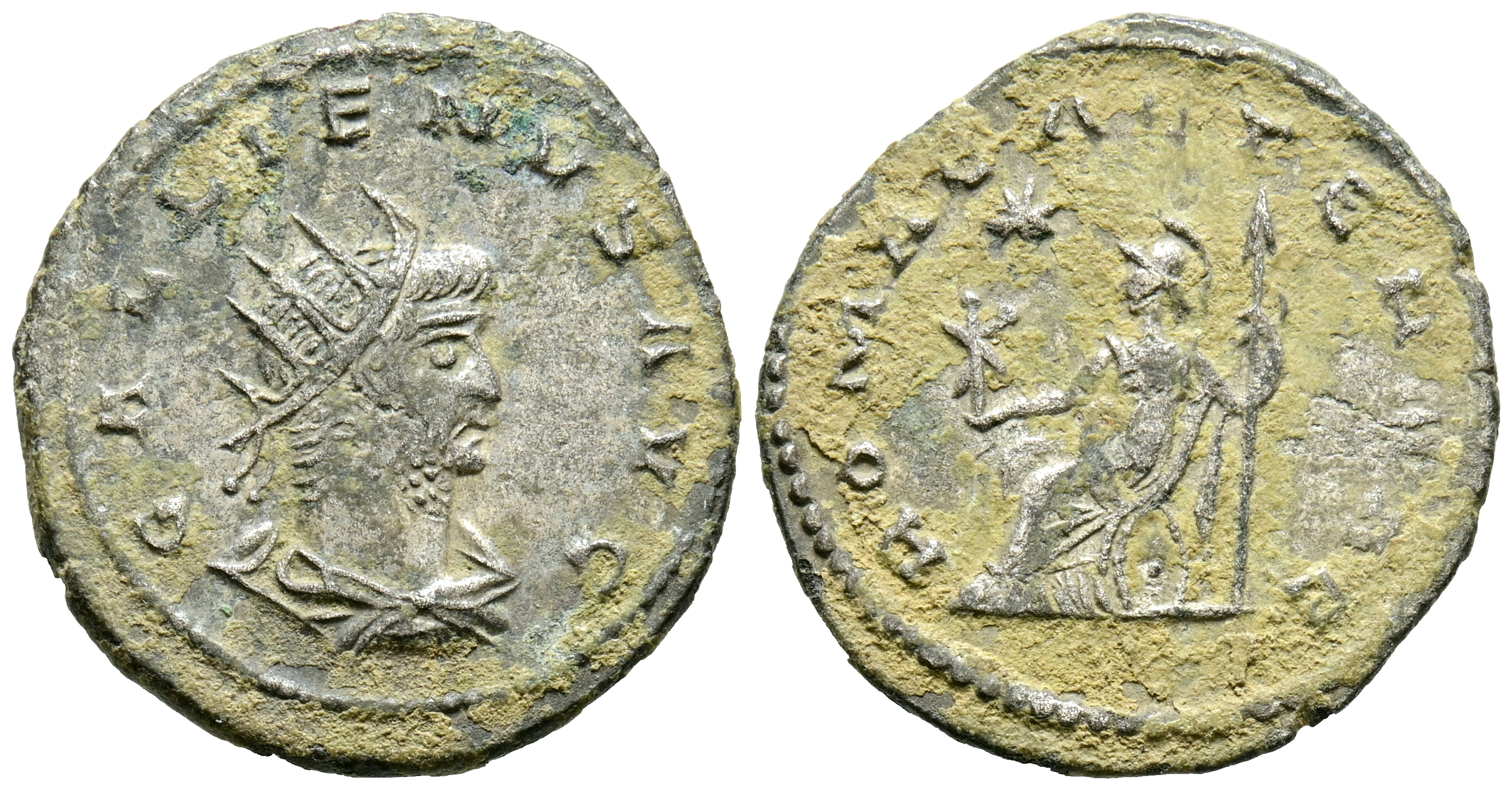 GALIENO. Antoniniano. (Ar. 2,61g/21mm). 263-264 d.C. Antioquía. (RIC 654). Anv: Busto radiado y drapeado de Galieno a derecha, alrededor leyenda: GALLIENVS AVGRev: Roma sentada a izquierda con Victoria y lanza, alrededor leyenda: ROMAE AETERNAE. MBC+ . Restos de plateado original.