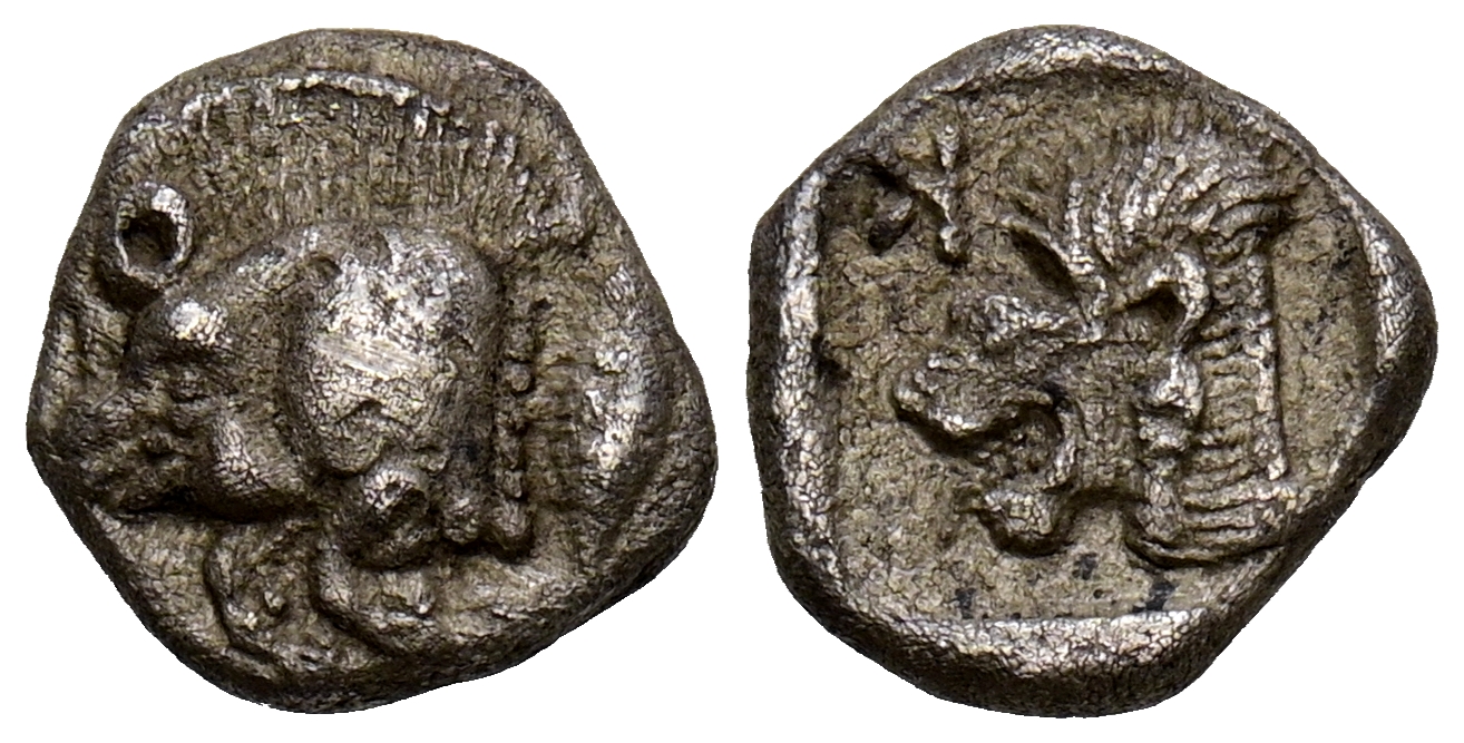 MISIA, Cícico. Hemióbolo. (Ar. 0,81g/9mm). 500-490 a.C. (SNG Copenhagen 380). Anv: Parte delantera de jabalí a izquierda, detrás atún. Rev. Cabeza de león a izquierda, encima K retrógrada. MBC.