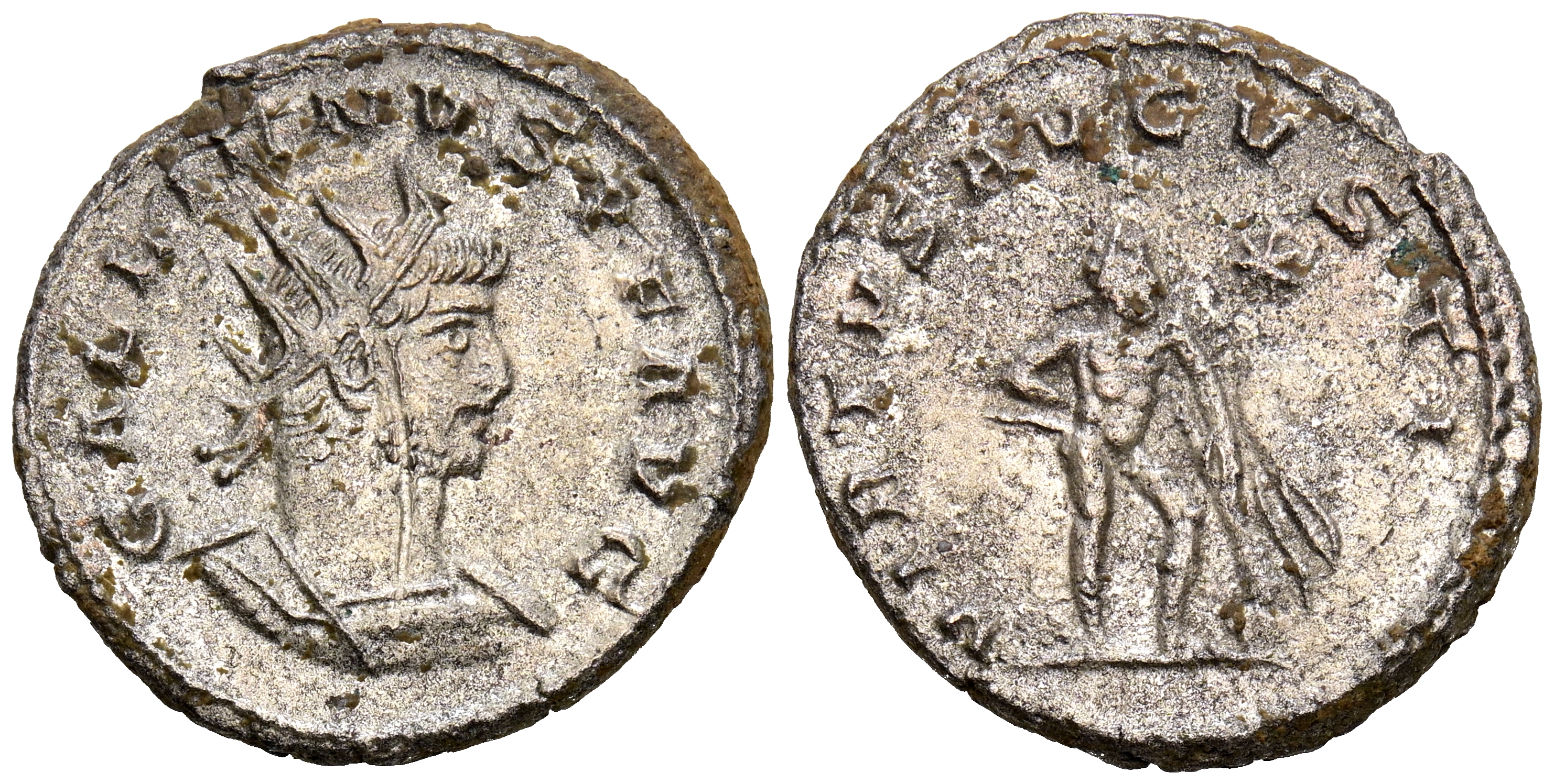 GALIENO. Antoniniano. (Ve. 4,59g/21mm). 260-268 d.C. Antioquía. (RIC 672). Anv: Busto radiado y drapeado de Galieno a derecha, alrededor leyenda: GALLIENVS P F AVG. Rev: Hercules estante a derecha apyado sobre mazo, en campo estrella, alrededor leyenda: VIRTVS AVGVSTI. MBC+.