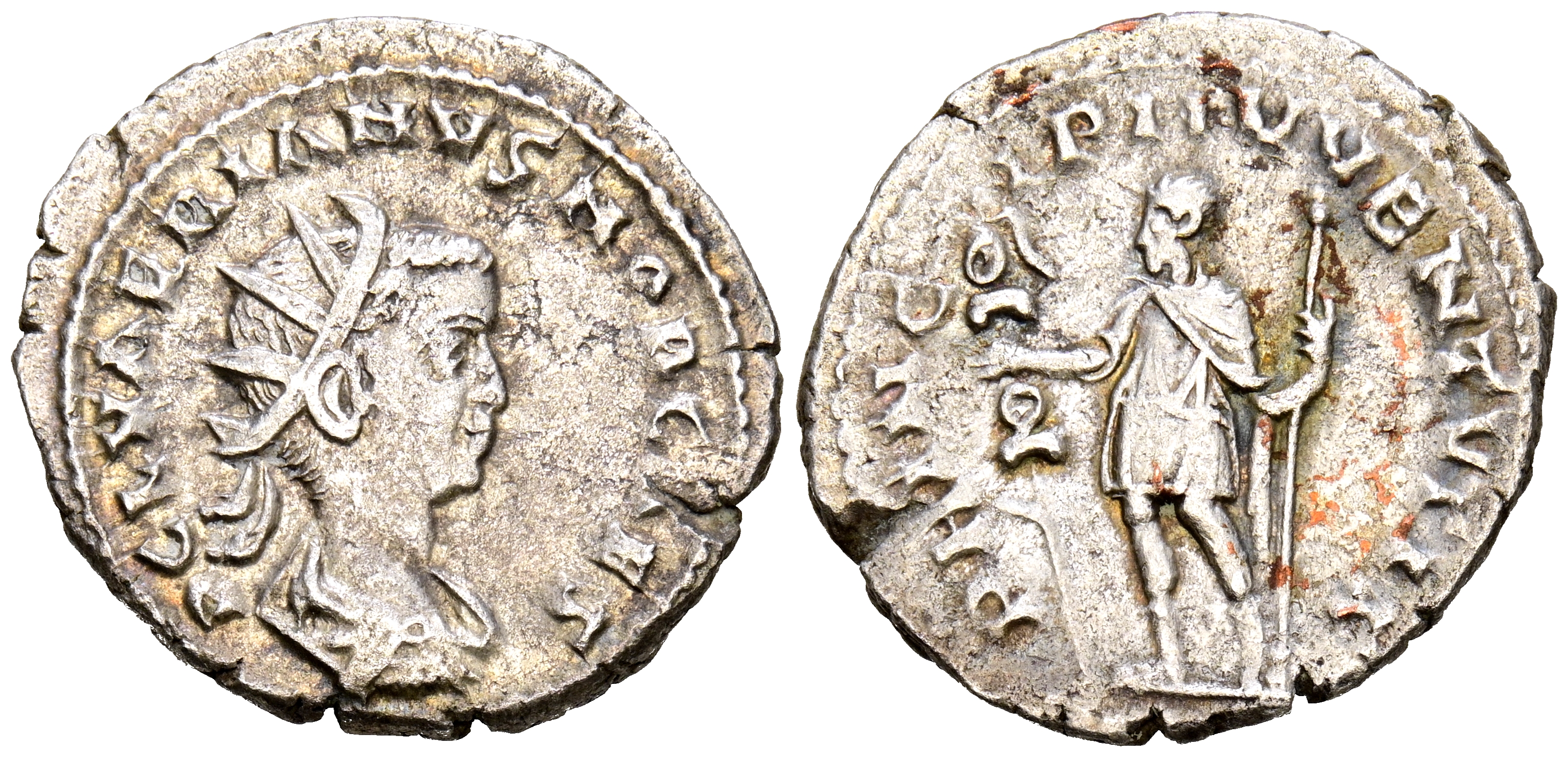 VALERIANO II. Antoniniano. (Ar. 3,64g/22mm). 255-257 d.C. Roma. (RIC 23). Anv: Busto radiado y drapeado de Valeriano II a derecha, alrededor leyenda: P CL VALERIANVS NOB CAES. Rev: Valeriano II estante a izquierda portando estandarte y cetro, alrededor leyenda: PRINCIPI IVVENTVTIS. MBC.