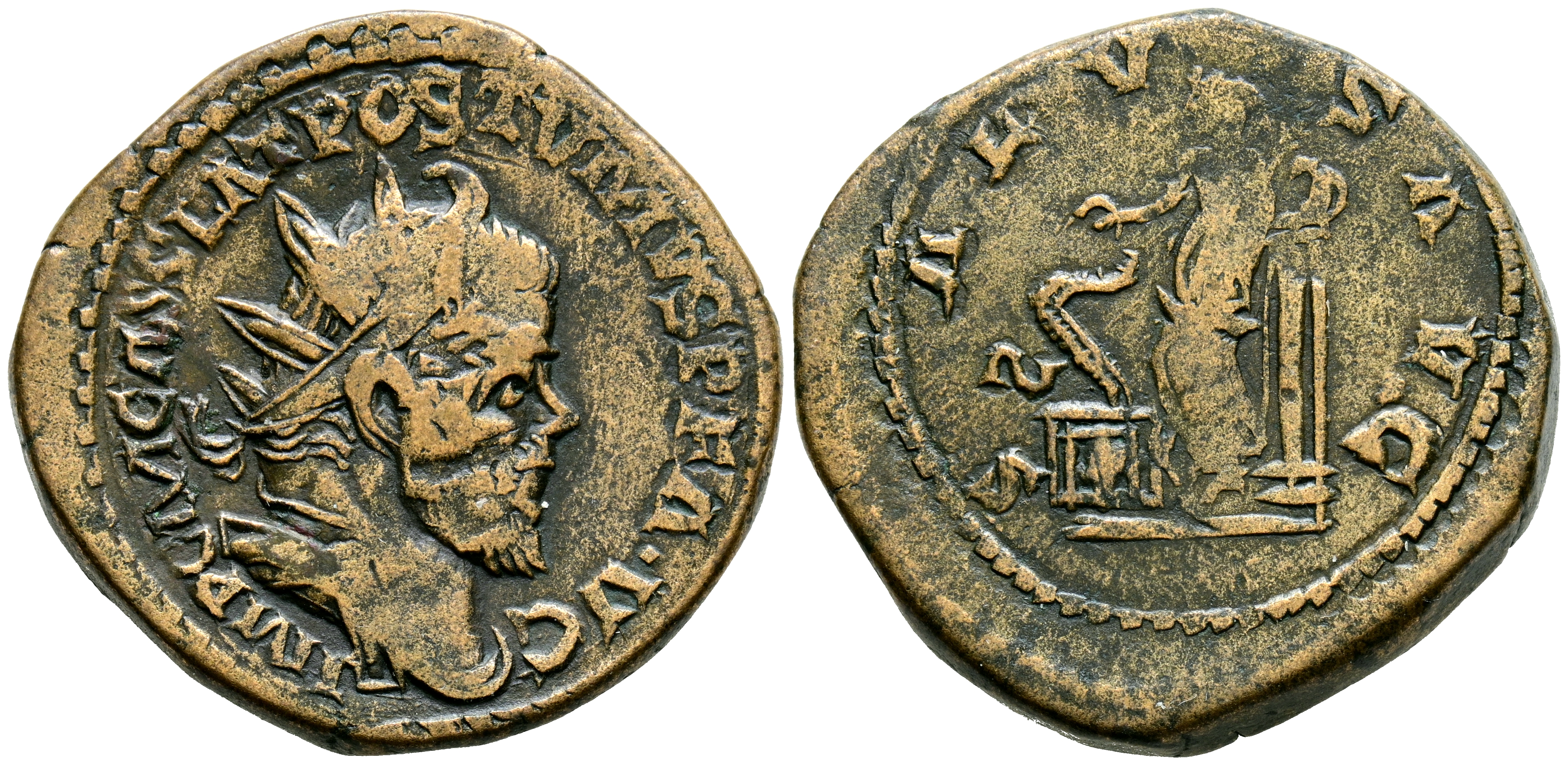 POSTUMO. Sestercio. (Ae. 22,55g/32mm). 260-269 d.C. ¿Treveri?. (RIC no cita). Anv: Busto radiado y drapeado de Póstumo a derecha, alrededor leyenda: IMP C M CASS LAT POSTVMVS P F AVG. Rev: Salus estante a izquierda apoyada en columna y alimentando a serpiente sobre altar de patera, en campo: S, alredededor leyenda: SALVS AVG. MBC. Raro ejemplar, no tenemos constancia de ningún sestercio de Póstumo con este reverso.