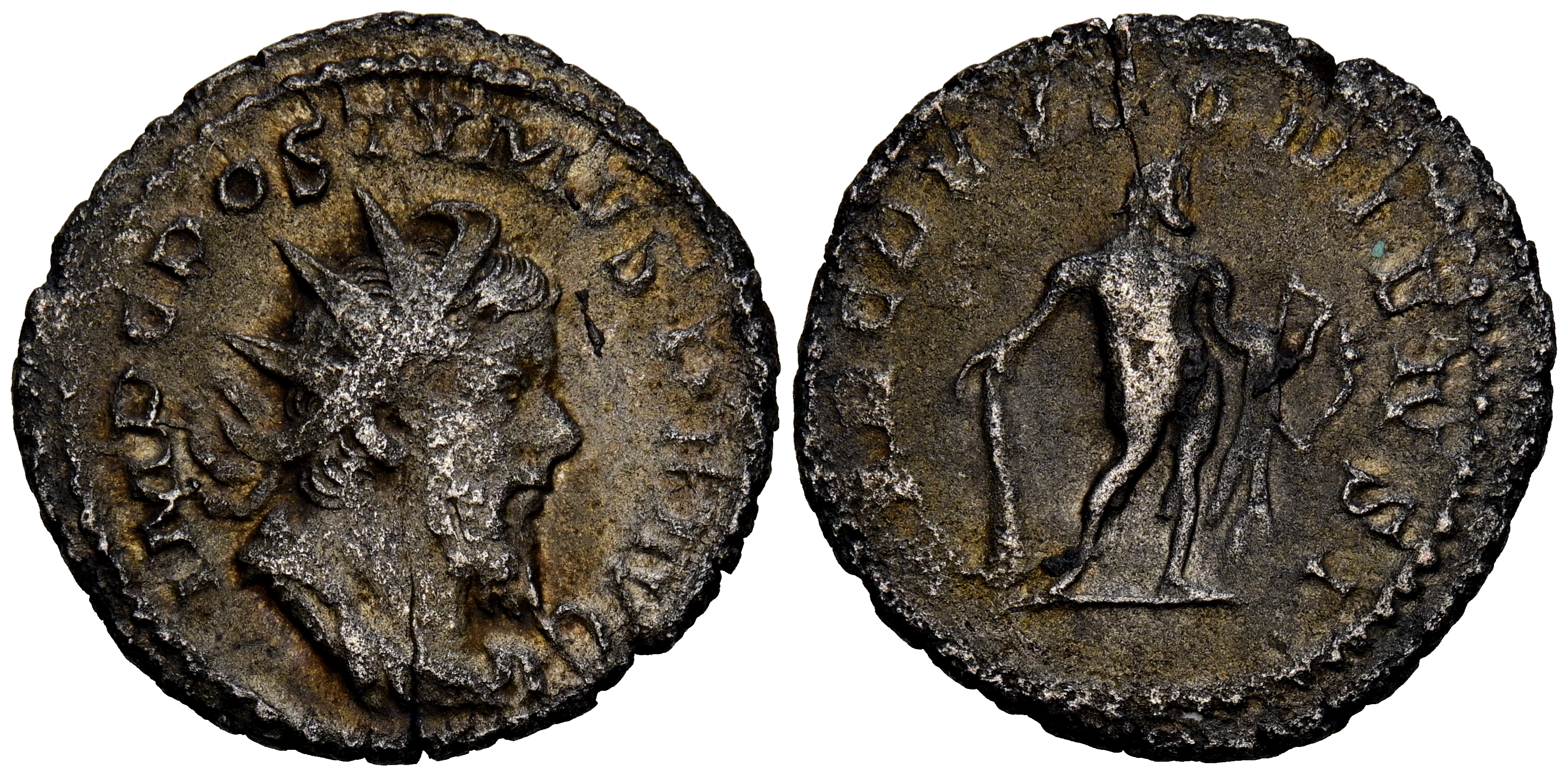 POSTUMO. Antoniniano. (Ar. 3,48g/22mm). 261 d.C. Treveri. (RIC 64). Anv: Busto radiado y con coraza de Póstumo a derecha, alrededor leyenda: IMP C POSTVMVS P F AVG. Rev: Hércules estante a derecha portando mazo, arco y piel de león, alrededor leyenda: HER DEVSONIENSI. MBC.