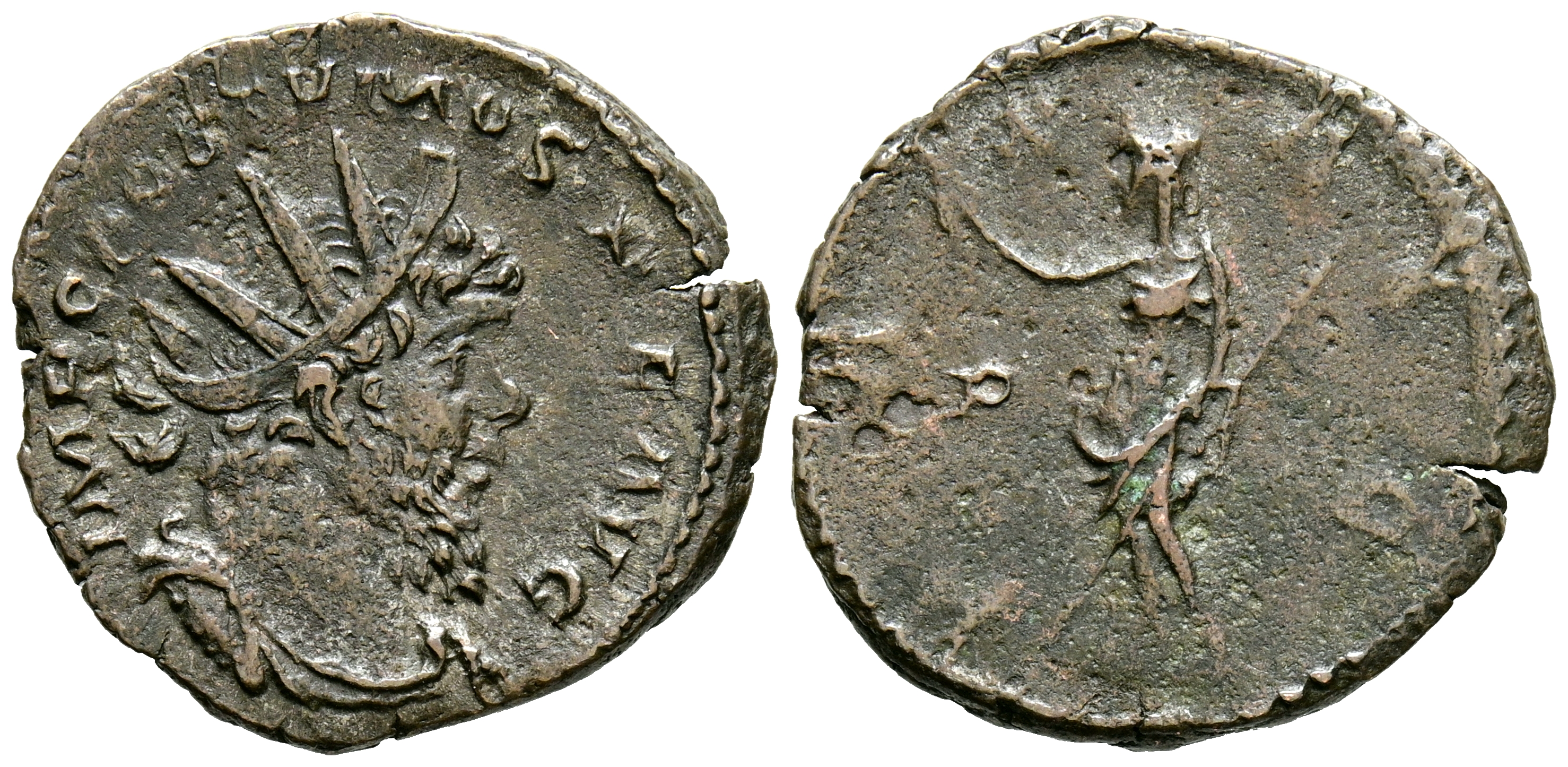 POSTUMO. Antoniniano. (Ve. 2,78g/21mm). 268 d.C. Treveri. (RIC 318). Anv: Busto radiado y drapeado de Póstumo a derecha, alrededor leyenda: IMP C POSTVMVS P F AVG. Rev: Pax estante a izquierda portando rama y cetro, en campo: P, alrededor leyenda: PAX AVG. MBC+/MBC-.