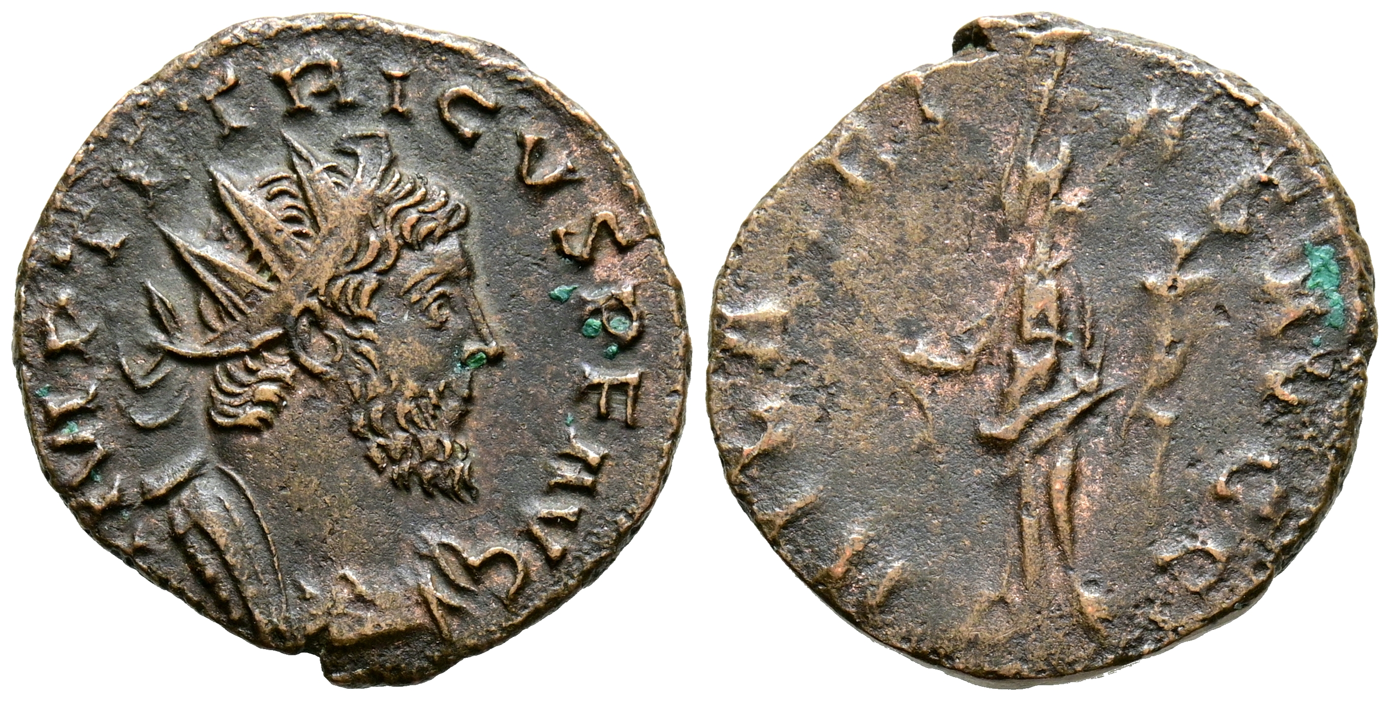 TETRICO I. Antoniniano. (Ve. 2,98g/19mm). 271-274 d.C. Treveri. (RIC 80). Anv: Busto radiado y drapeado de Tétrico I a derecha, alrededor leyenda: IMP C TETRICVS P F AVG. Rev: Hilaritas estante a la izquierda, sosteniendo rama y cornucopia, alrededor leyenda: HILARITAS AVGG. MBC+/MBC.
