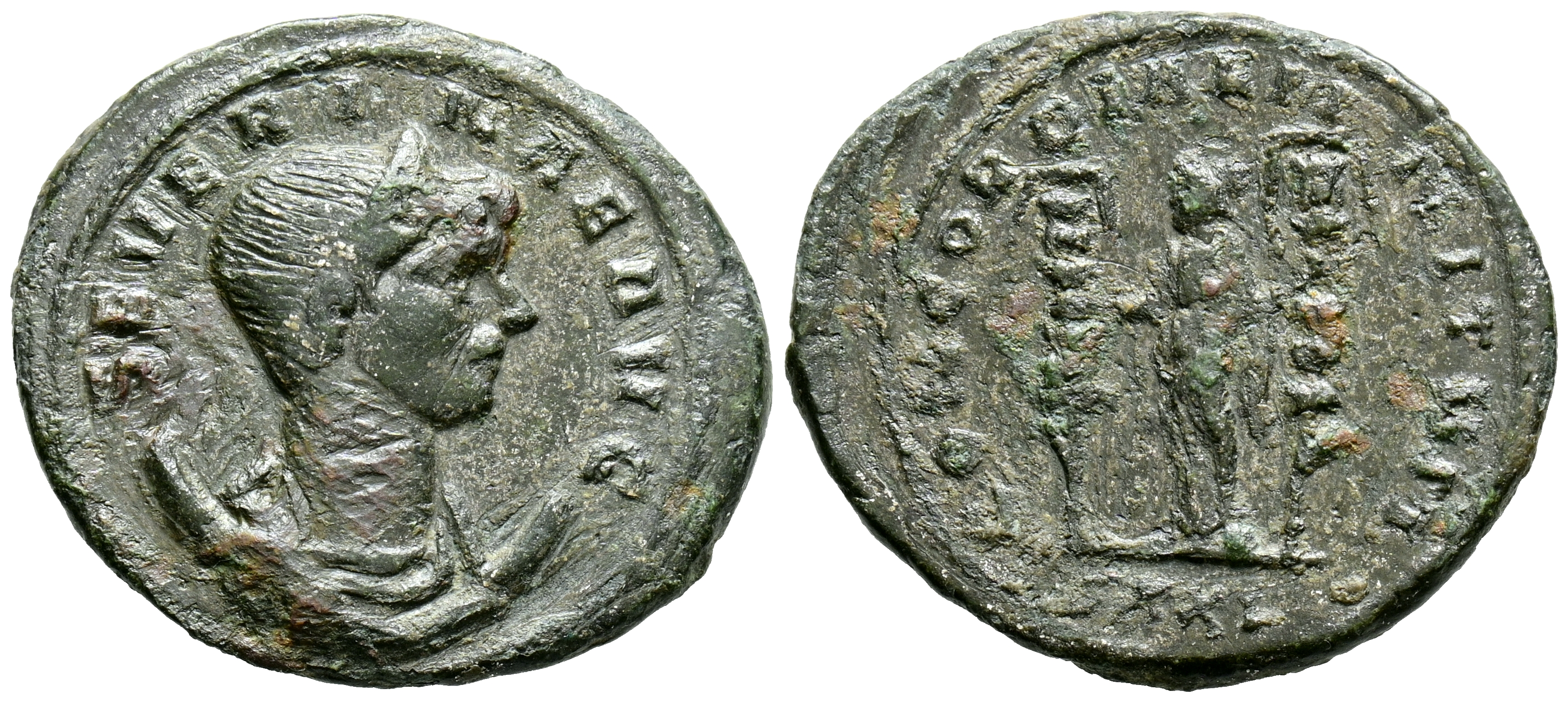 SEVERINA. Antoniniano. (Ae. 4,58g/24mm). 270-275 d.C. Roma. (RIC 1818). Anv: Busto diademado y drapeado de Severina a derecha sobre creciente, alrededor leyenda: SEVERINA AVG. Rev: Concordia estante a izquierda sosteneiendo estandartes, en exergo XXIR, alrededor leyenda: CONCORDIAE MILITVM. MBC. Escasa.