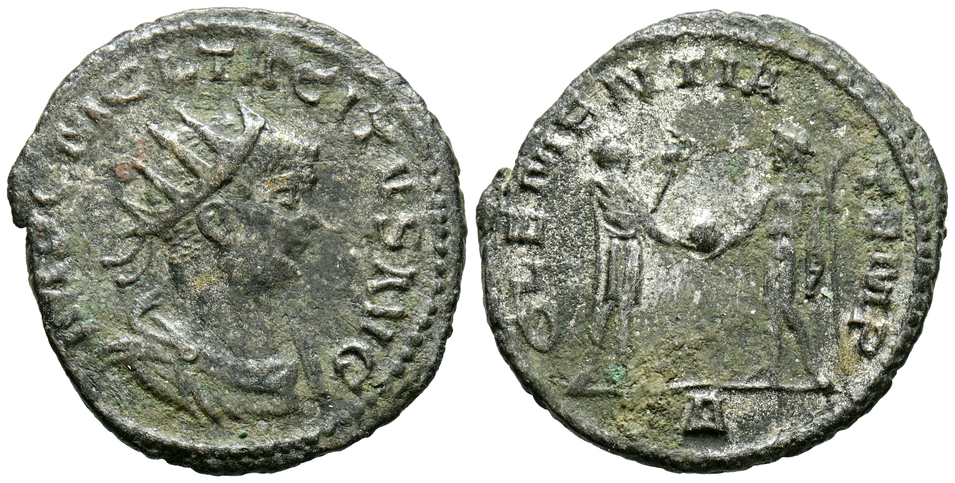 TACITO. Antoniniano. (Ae. 3,76g/23mm). 275-276 d.C. Antioquía. (RIC 126). Anv: Busto radiado, drapeado y con coraza de Tacito a derecha, alrededor leyenda: IMP C M CL TACITVS AVG. Rev: Emperador en pie a derecha portando lanza, frente a él Júpiter con lanza entregándole un globo, en exergo : A, alrededor leyenda: CLEMENTIA TEMP. MBC. Restos de plateado original.