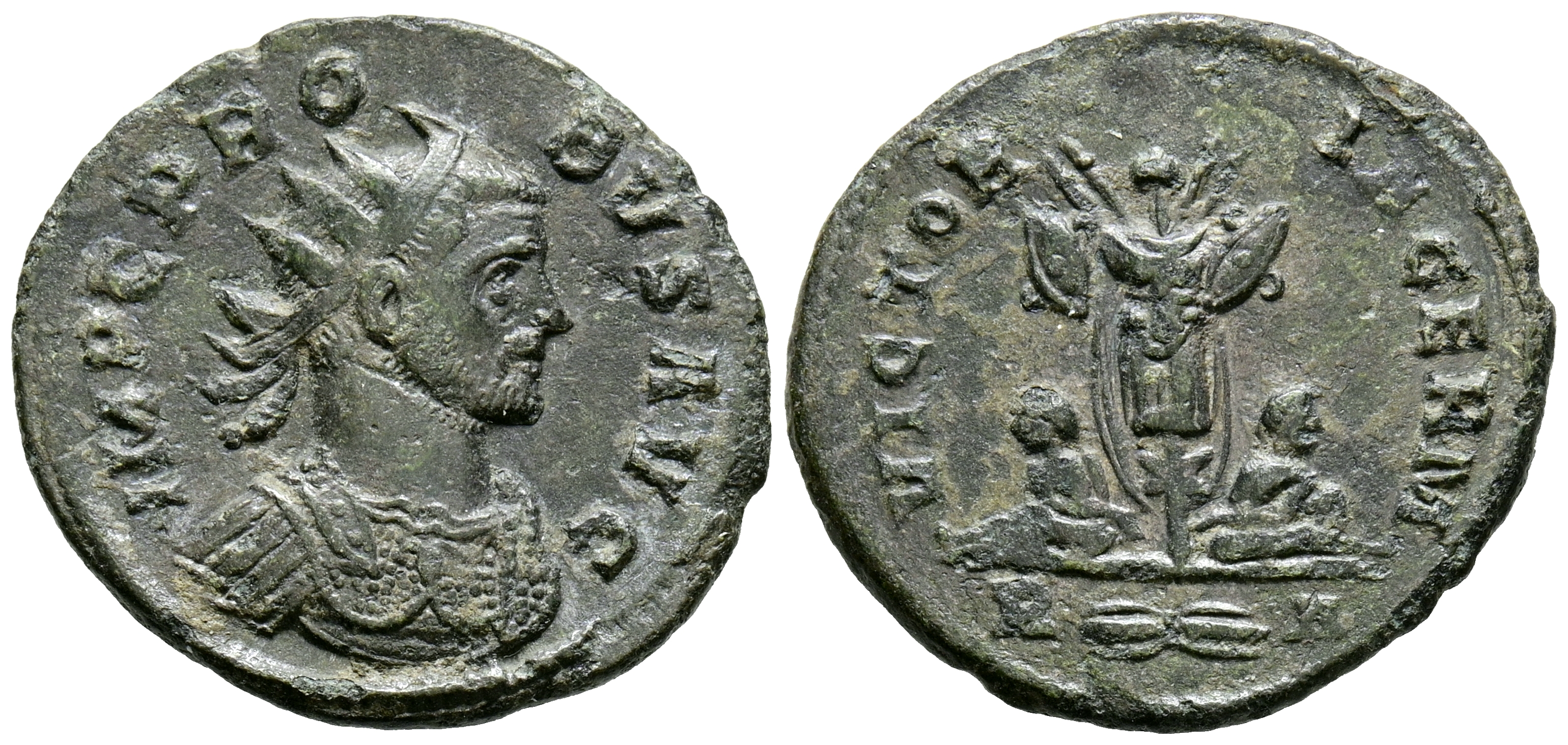 PROBO. Antoniniano. (Ae. 3,18g/21mm). 282. d.C. Roma. (RIC 223). Anv: Busto radiado, drapeado y con coraza de Probo a derecha, alrededor leyenda: IMP PROBVS AVG. Rev: Trofeo entre dos cautivos sentados, en exergo: R-fúlmen-A, alrededor leyenda: VICTORIA GERM. MBC+.