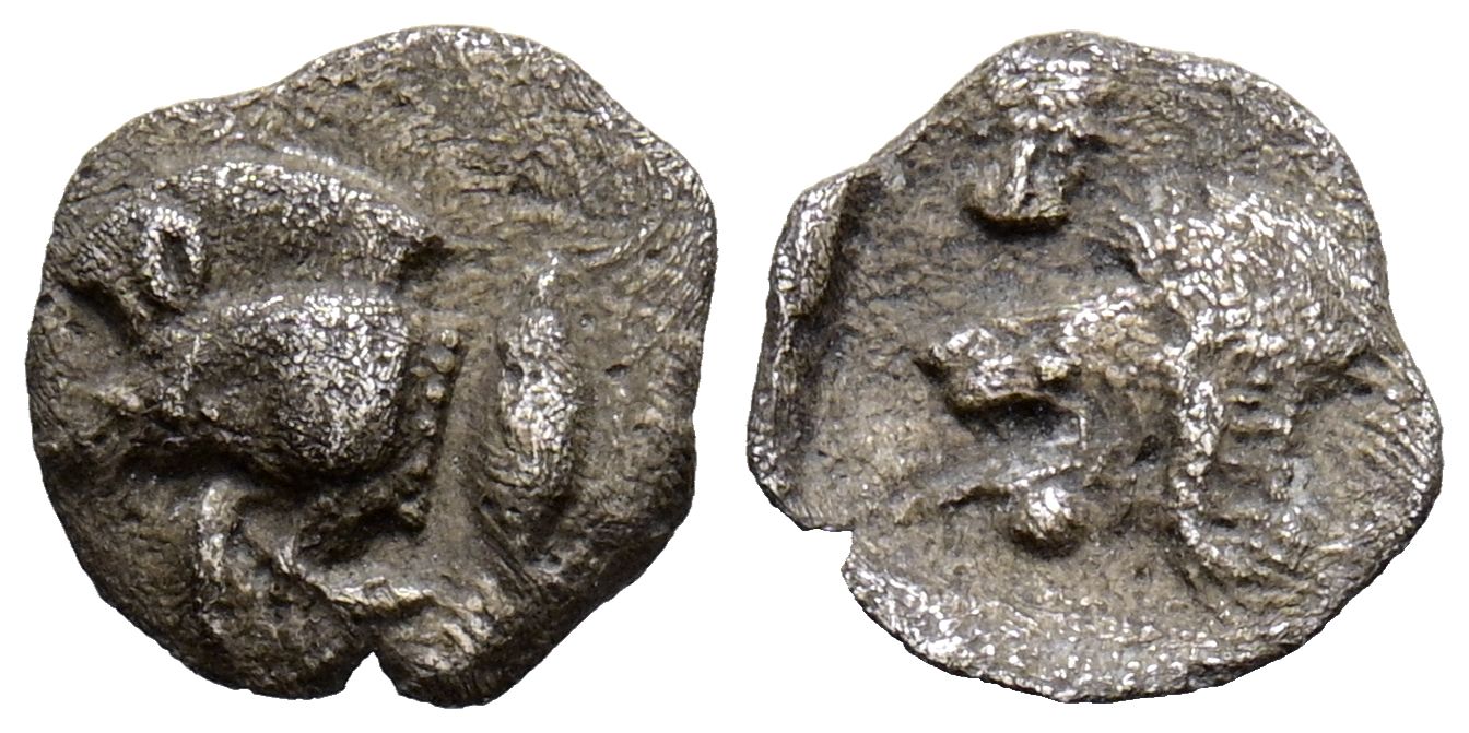 MISIA, Cícico. Obolo. (Ar. 0,33g/9mm). 450-400 a.C. (SNG France 5386). Anv: Parte delantera de Jabalí a izquierda, detrás atún. Rev: Cabeza de león a izquierda dentro de cuadrado incuso, en campo cabeza de lobo de frente. MBC.