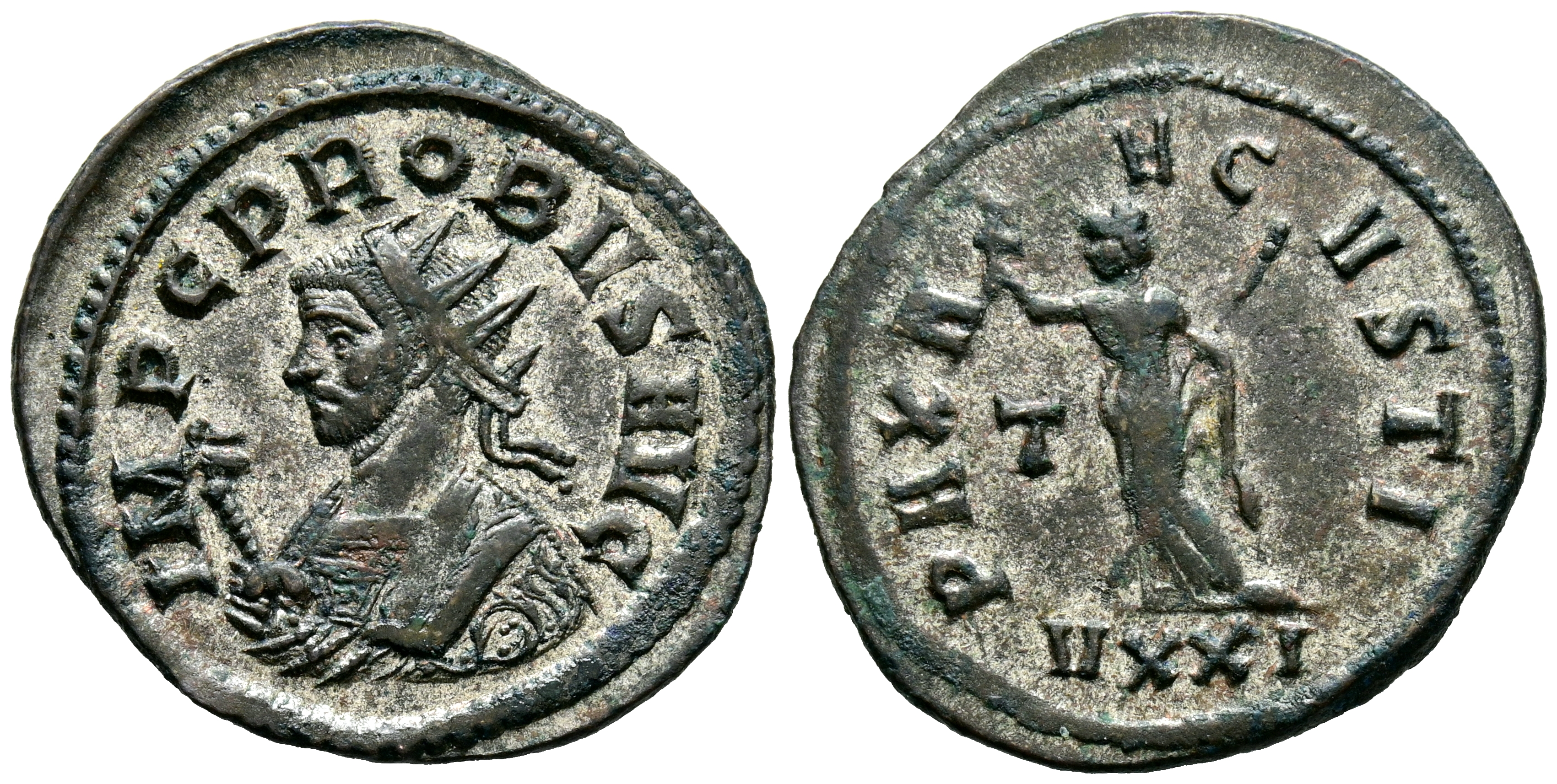 PROBO. Antoniniano. (Ve. 3,55g/25mm). 281 d.C. Ticinium. (RIC 516). Anv: Busto radiado y con coraza de Probo a izquierda portando cetro con águila, alrededor leyenda: IMP C PROBVS AVG. Rev: Pax estante a izquierda portando rama y cetro, en campo: T, en exergo: VXXI, alrededor leyenda: PAX AVGVSTI. MBC. Ligeros restos de plateado original.