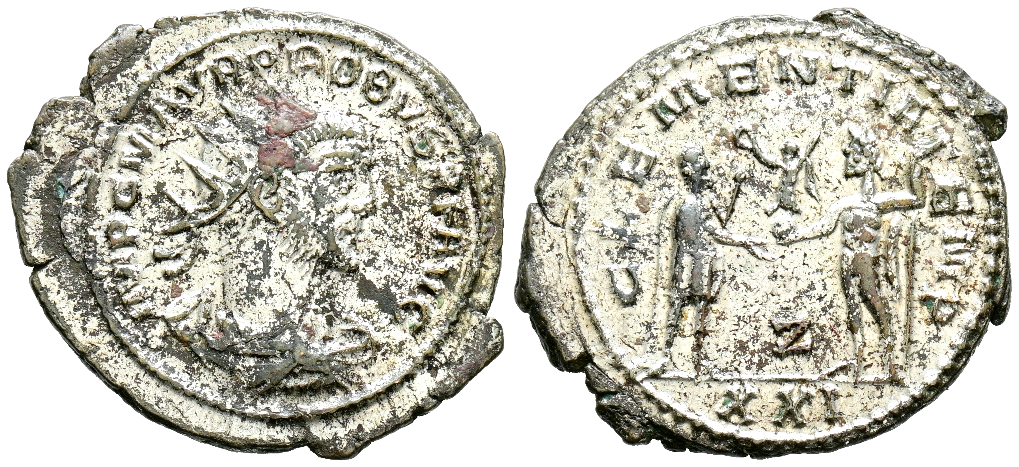 PROBO. Antoniniano. (Ve. 3,54g/24mm). 276 d.C. Antioquía. (RIC 920). Anv: Busto radiado, drapeado y con coraza de Probo a derecha, alrededor leyenda: IMP C M AVR PROBVS P F AVG. Rev: Probo estante a derecha portando lanza y recibiendo Victoria sobre globo de Júpiter estante a izquierda portando cetro, entre ellos: Z, en exergo: XXI, alrededor leyenda: CLEMENTIA TEMP. MBC+. Restos de plateado original.
