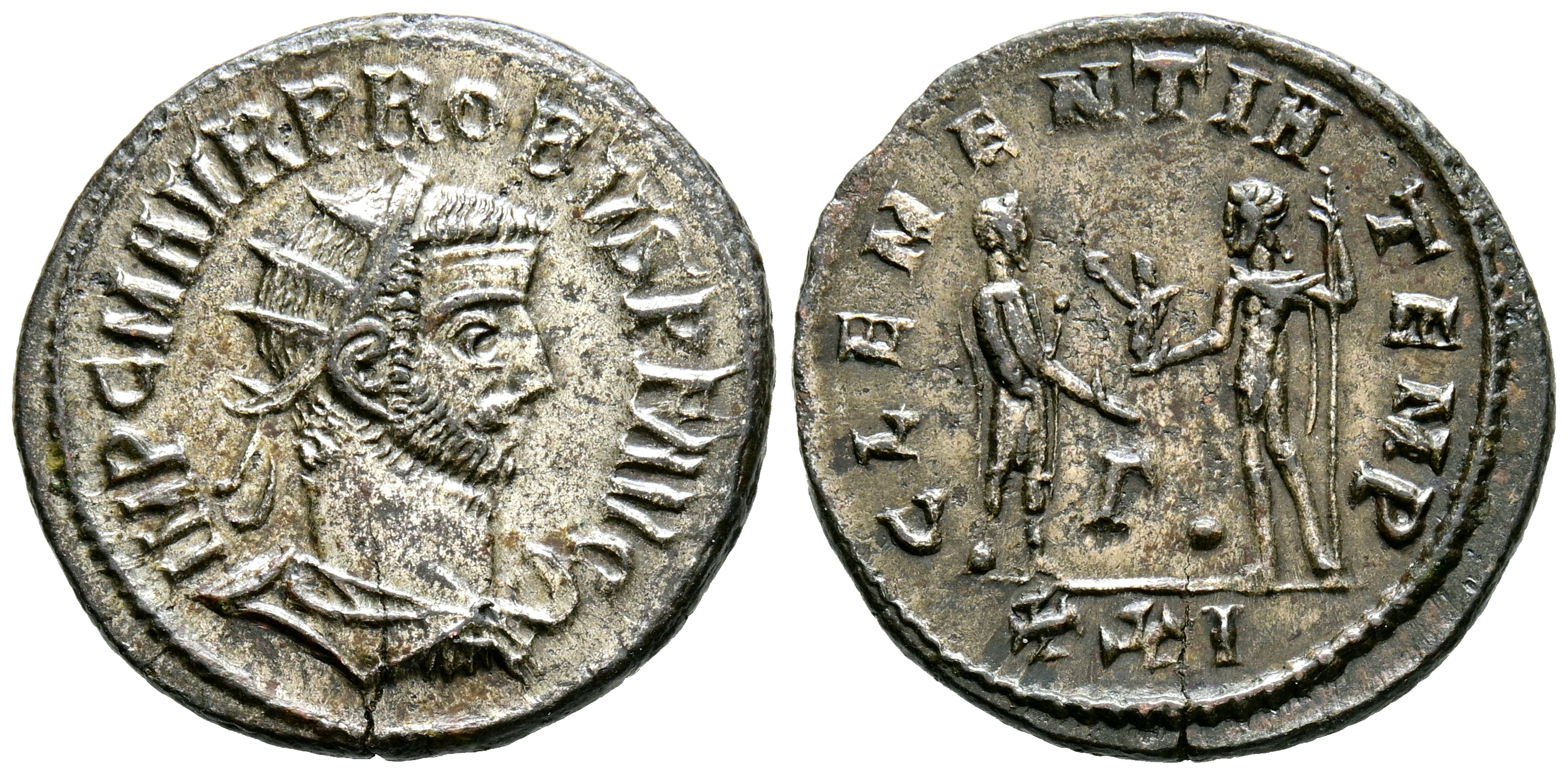 PROBO. Antoniniano. (Ae. 3,77g/21mm). 276 d.C. Antioquía. (RIC 920). Anv: Busto radiado, drapeado y con coraza de Probo a derecha, alrededor leyenda: IMP C M AVR PROBVS P F AVG. Rev: Probo estante a derecha portando lanza y recibiendo Victoria sobre globo de Júpiter estante a izquierda portando cetro, entre ellos: r, en exergo: XXI, alrededor leyenda: CLEMENTIA TEMP. MBC+. Plateado original.