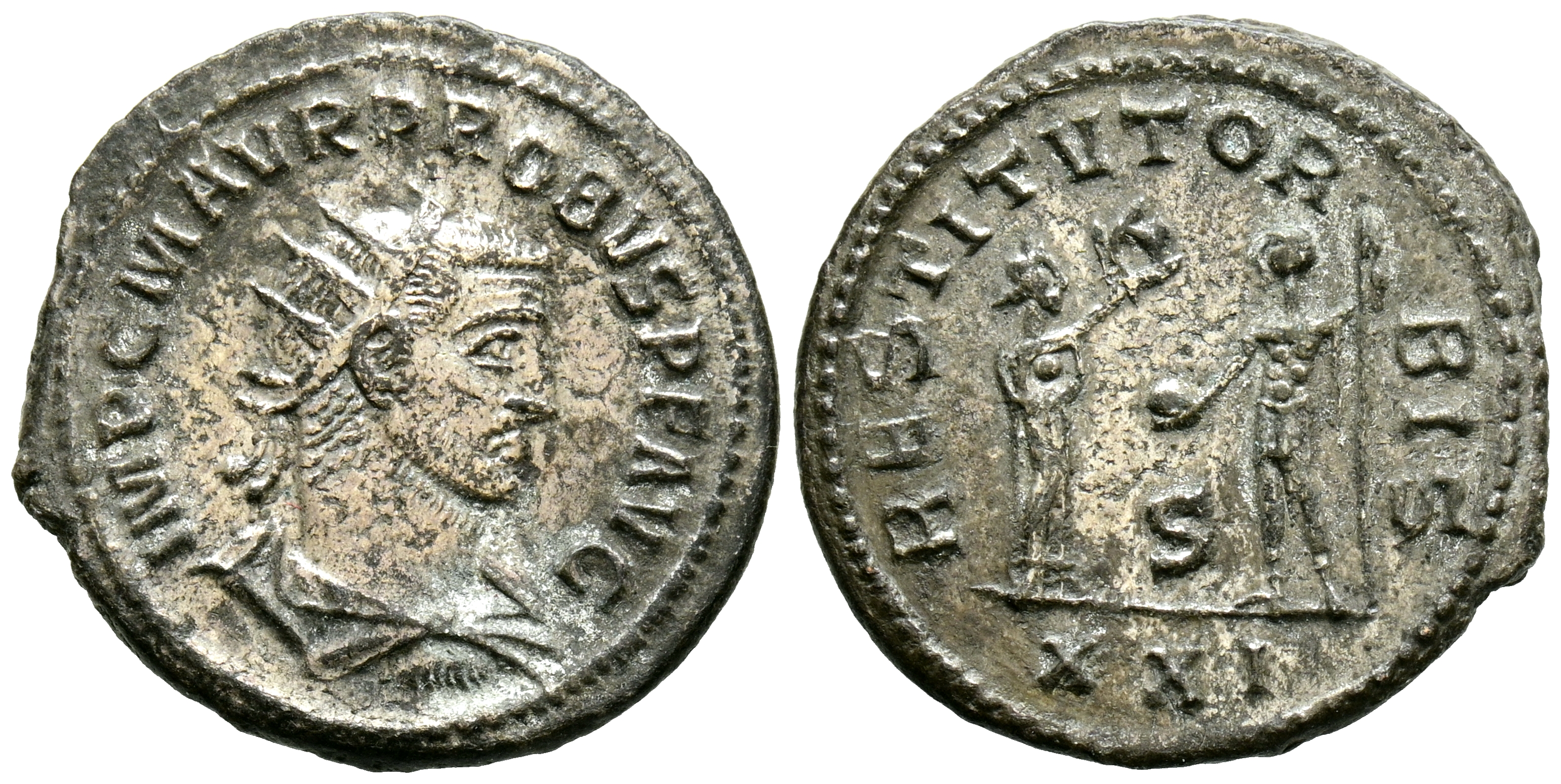 PROBO. Antoniniano. (Ae. 3,48g/21mm). 276 d.C. Antioquía. (RIC 921). Anv: Busto radiado, drapeado y con coraza de Probo a derecha, alrededor leyenda: IMP C M AVR PROBVS P F AVG. Rev: Mujer ofreciendo corona de laurel a Probo portando cetro, entre ellos: S, en exergo: XXI, alrededor leyenda: RESTITVT ORBIS. EBC-. Restos de plateado original.