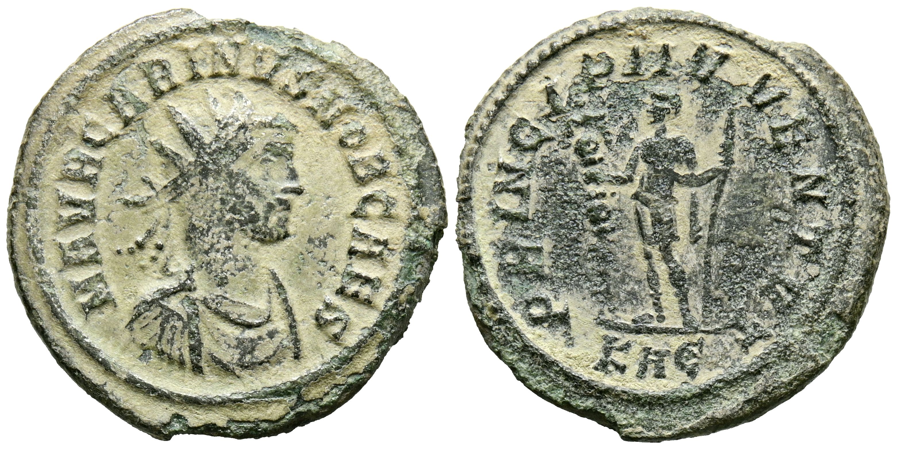 CARINO. Antoniniano. (Ae. 3,05g/22mm). 283-285 d.C. Roma. (RIC 267). Anv: Busto radiado y drapeado con coraza a derecha, alrededor leyenda: M AVR CARINVS NOB CAES. Rev: Carino estante a izquierda sosteniendo signum y cetro, en exergo: KAE, alrededor leyenda: PRINCIP IVVENTVT. MBC-.