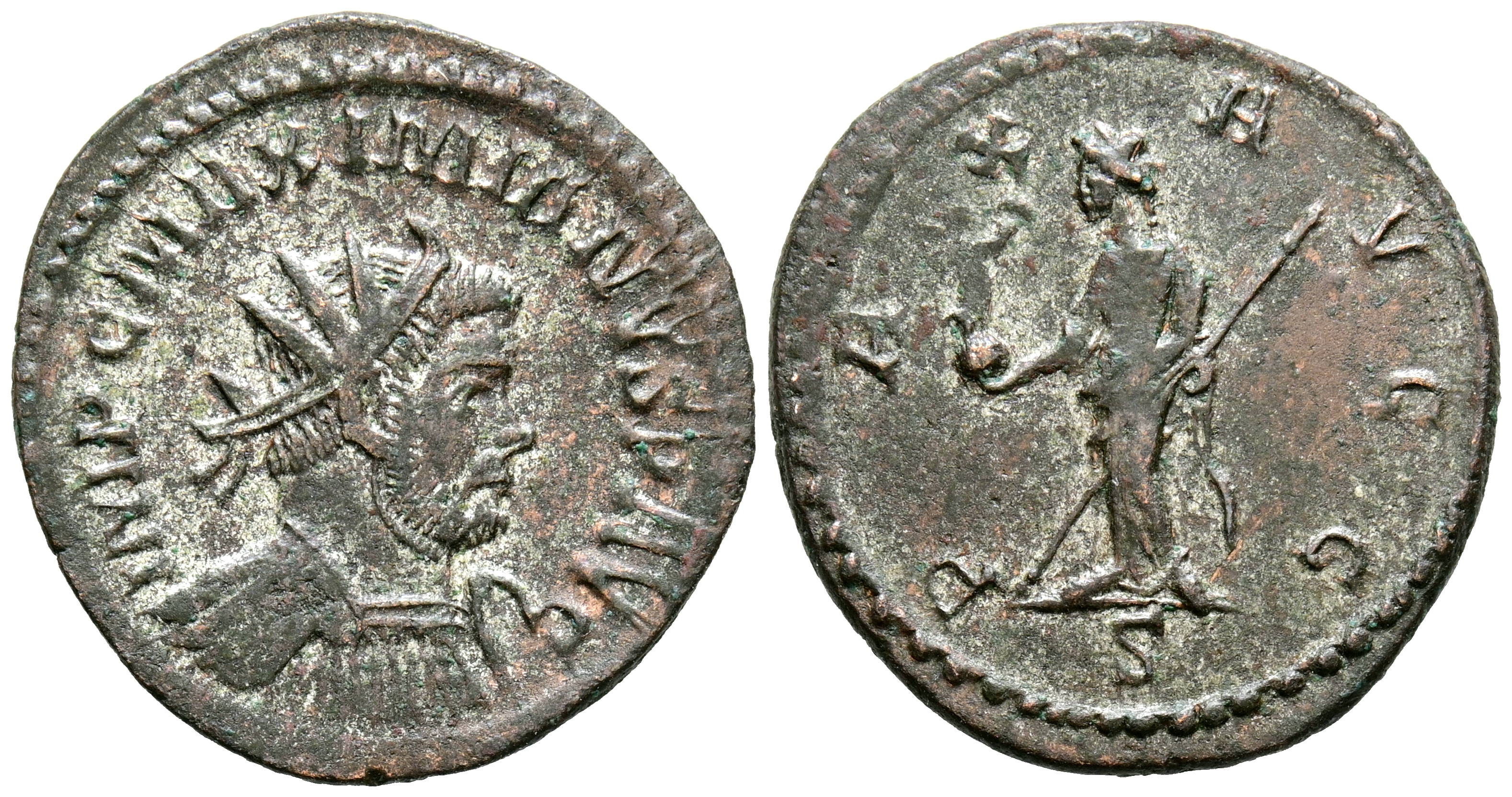 MAXIMIANO. Antoniniano. (Ae. 3,58g/23mm). 289 d.C. Lugdunum. (RIC 396). Anv: Busto radiado y con coraza de Maximiano a derecha, alrededor leyenda: IMP C MAXIMIANVS P AVG. Rev: Pax estante a la izquierda, sosteniendo la Victoria sobre globo y cetro; en exergo S, alrededor leyenda: PAX AVG. MBC.