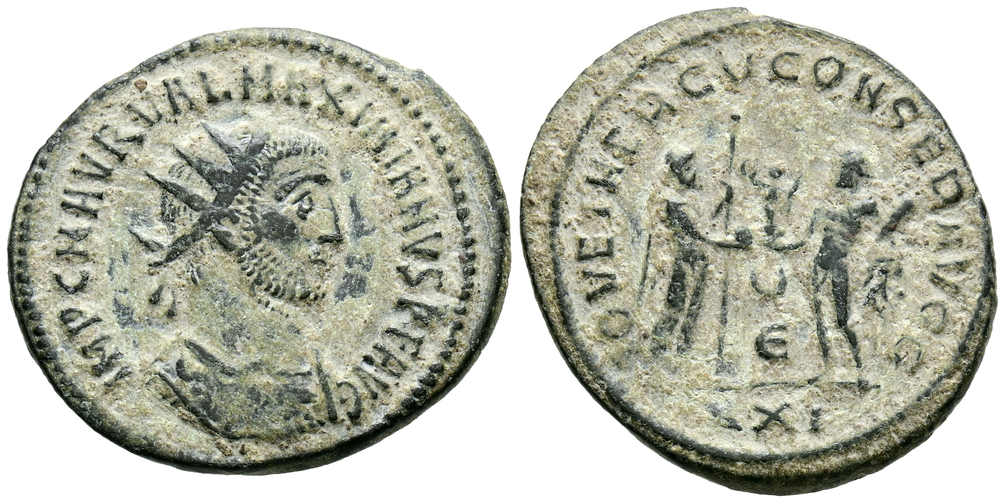 MAXIMIANO I. Antoniniano. (Ae. 4,11g/23mm). 285-295 d.C. Antioquia. (RIC 622). Anv: Busto radiado y con coraza de Maximiano a derecha, alrededor leyenda: IMP C M AVR VAL MAXIMIANVS P F AVG. Rev: Júpiter estante a derecha portando globo y lanza, delante Hércules estante a izquierda portando mazo y Victoria con corona de laurel, entre ellos: Creciente/E, en exergo: XXI, alrededor leyenda: IOVI ET HERCVLI CONSER AVGG. MBC.