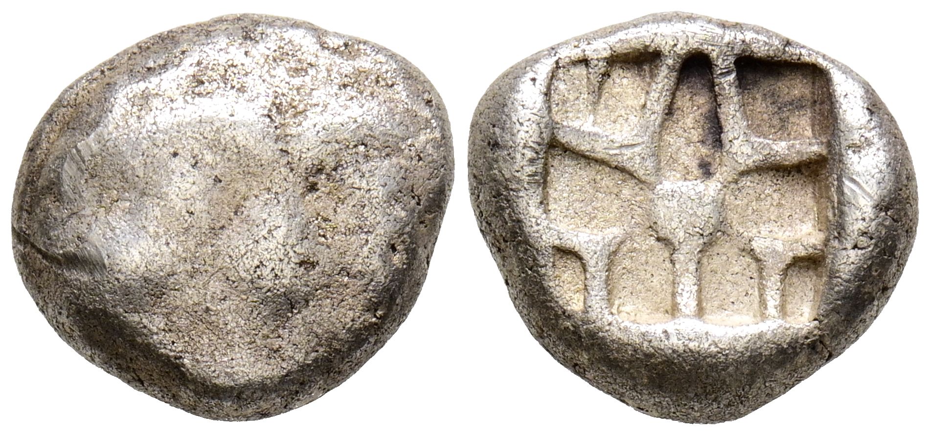 MISIA, Parion. Dracma. (Ar. 3,15g/13mm). 550-520 a.C. (SNG Copenhagen 256). Anv: Cabeza de medusa a de frente. Rev: Patrón linear incuso. BC+.