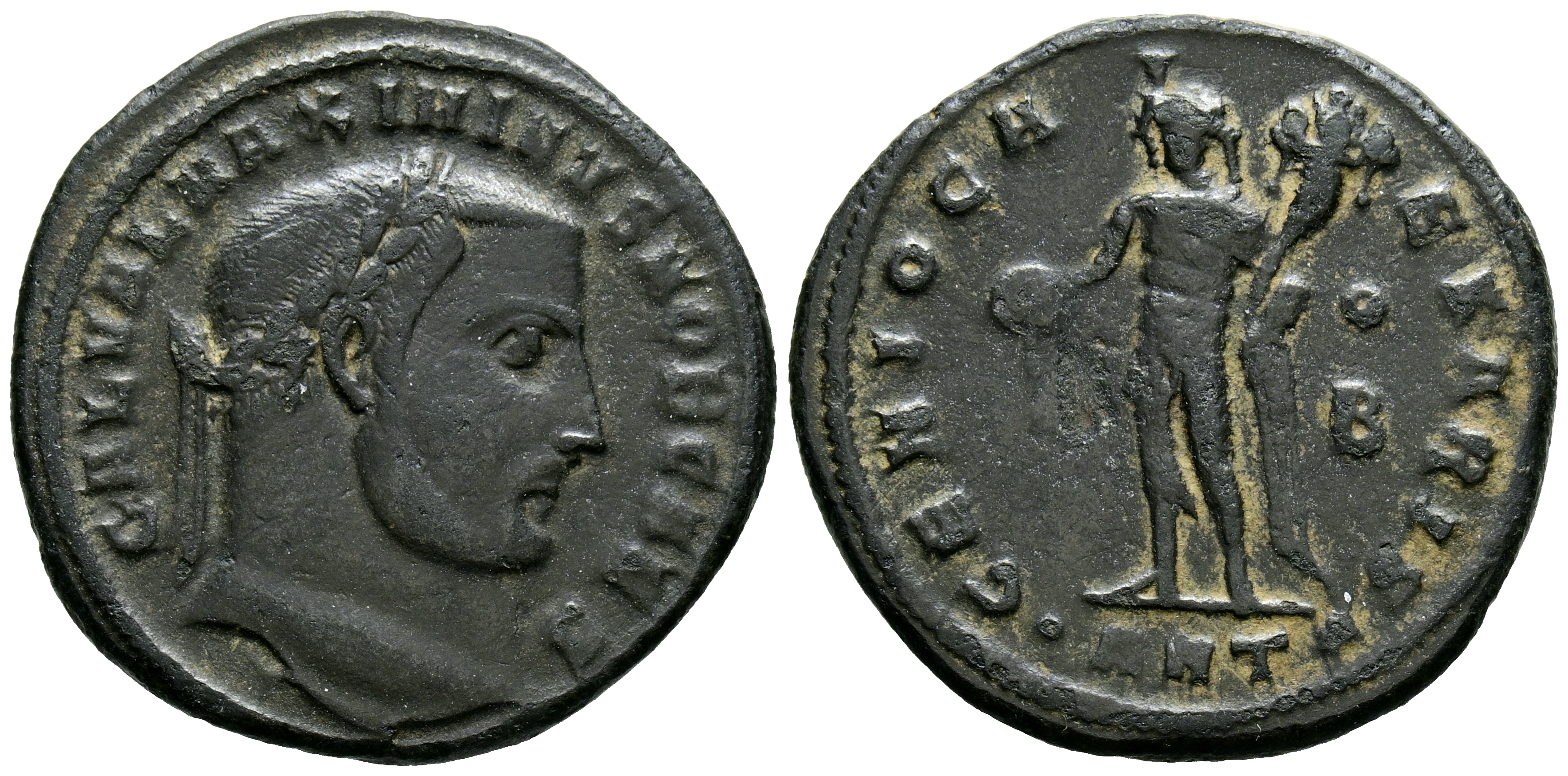 MAXIMINO DAIA. Follis (Ae. 5,15g/24mm). 310 d.C. Antioquía. (RIC-110). Anv: Cabeza laureado a derecha de Maximino Daia, alrededor leyenda: GAL VAL MAXIMINVS NOB CAES. Rev: Genio estante a la izquierda portando patera y cornucopia, en campo: O/B, en exergo: ANT. MBC.