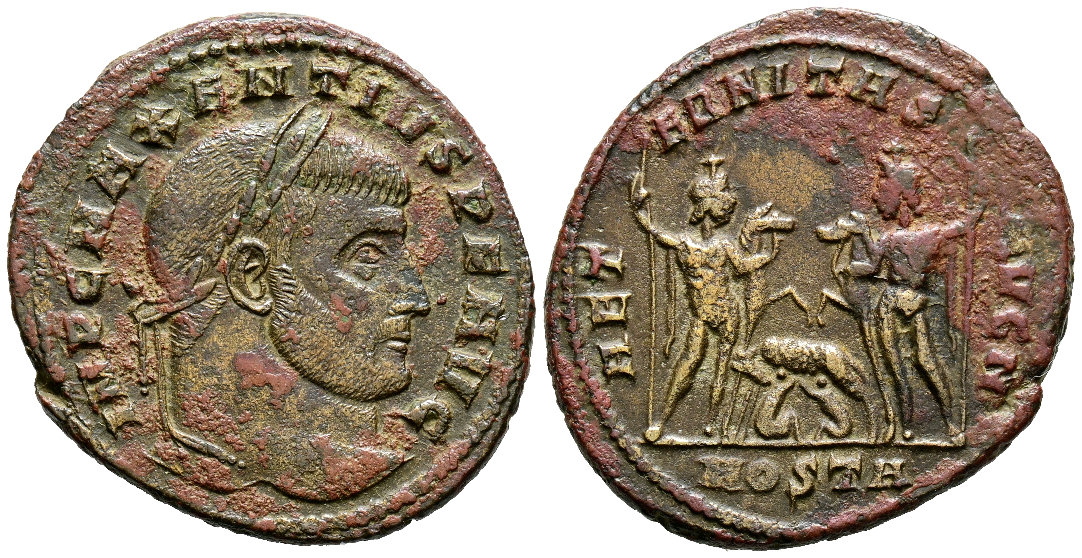 MAXENTIO. Follis. (Ae. 6,54g/27mm). 307-312 d.C. Ostia. (RIC 35). Anv: Cabeza laureada de Maxentio a derecha, alrededor leyenda: IMP C MAXENTIVS P F AVG. Rev: Dioscuros enfrentados con cetros y sujetando caballos, en exergo: MOSTS, alrededor leyenda: AETERNITAS AVG N. MBC. Limpiada.