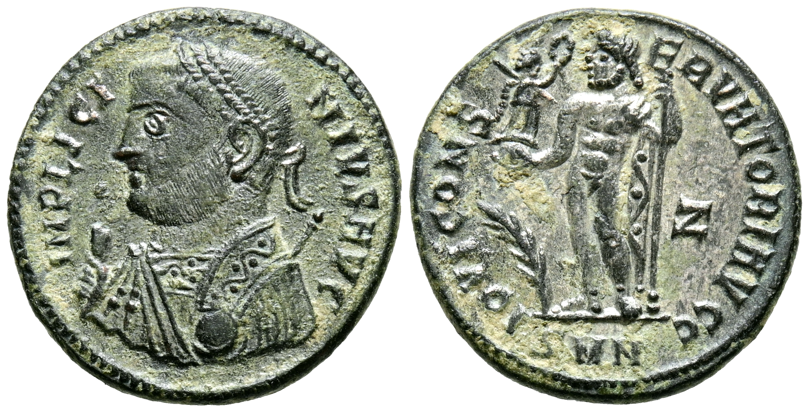 LICINIO I. Follis. (Ae. 2,98g/19mm). 308-324 d.C. Nicomedia. (RIC 34). Anv: Busto laureado y con coraza de Licinio I a izquierda portando cetro y mappa, alrededor leyenda: IMP LICINIVS AVG. Rev: Júpiter estante a izquierda portando cetro y Victoria con corona de laurel, entre palma y Z, en exergo: SMN, alrededor leyenda: IOVI CONSERVATORI AVGG. EBC-. Restos del plateado original.