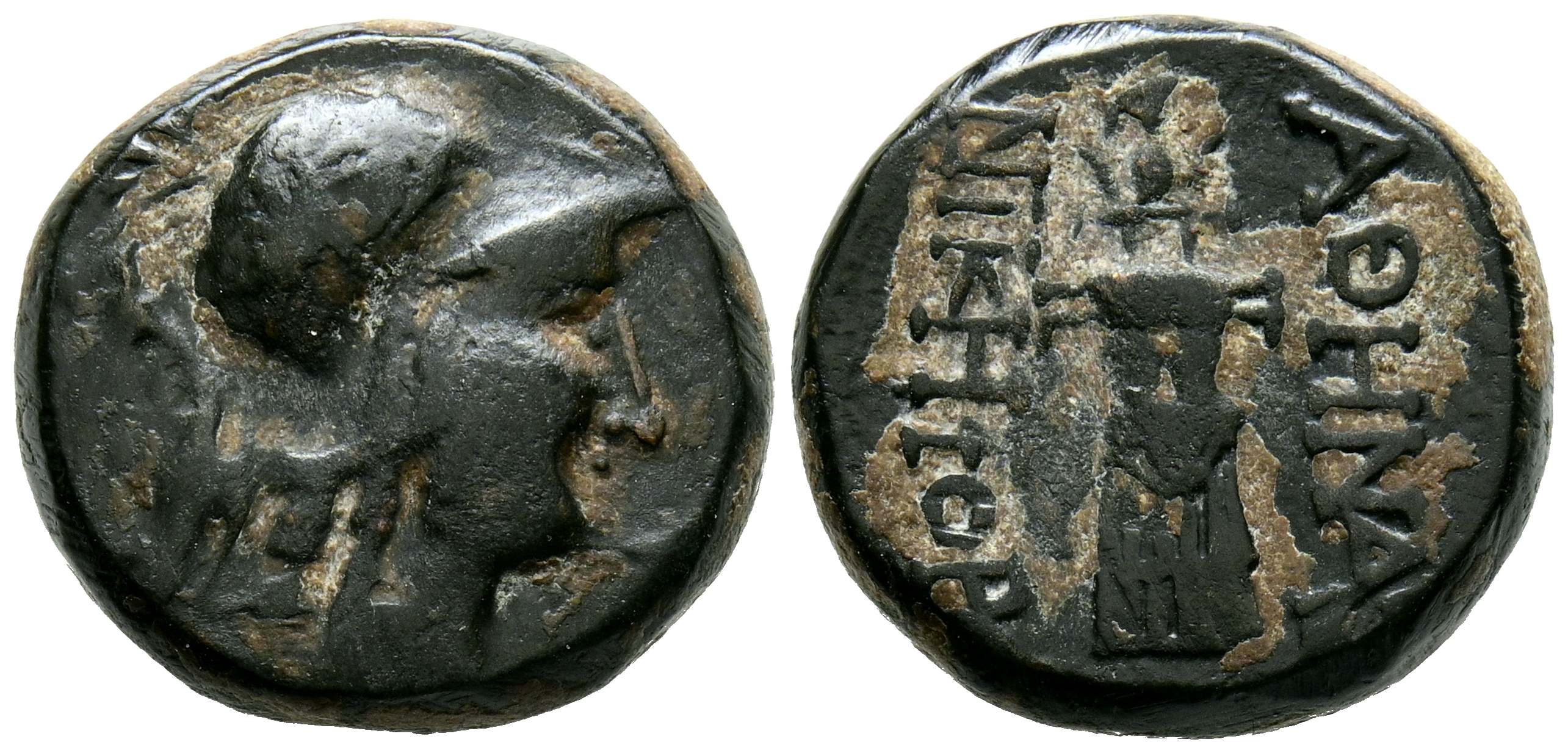 MISIA, Pérgamo. Ae19. (Ae. 6,88g/18mm). Siglo II a.C. (SNG von Aulock 1374). Anv: Cabeza de Atenas con casco a derecha. Rev: Trofeo de casco y coraza, alrededor leyenda griega: AΘHNAΣ NIKHΦOPOY. MBC-.
