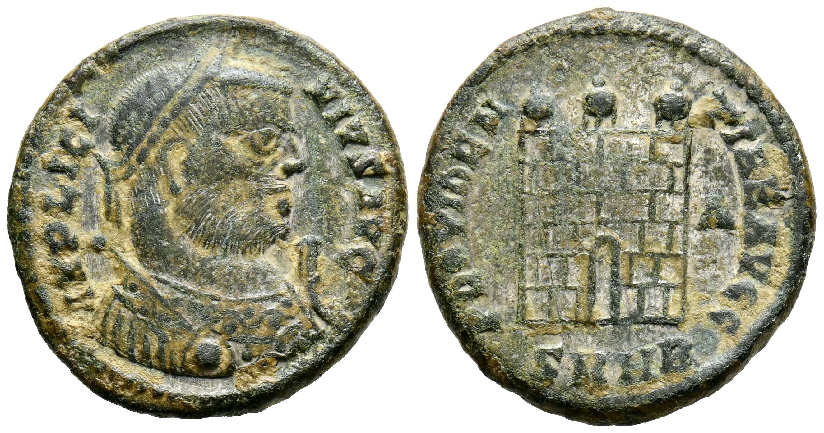 LICINIO I. Follis. (Ae. 3,54g/19mm). 318-320 d.C. Heráclea. (RIC 47). Anv: Busto laureado y drapeado a derecha de Licinio I portando mappa y globo y cetro, alrededor leyenda: IMP LICINIVS AVG. Rev: Puerta de campamento con tres almenas, en exergo: SMHB, alrededor leyenda: PROVIDENTIAE AVGG. MBC+.