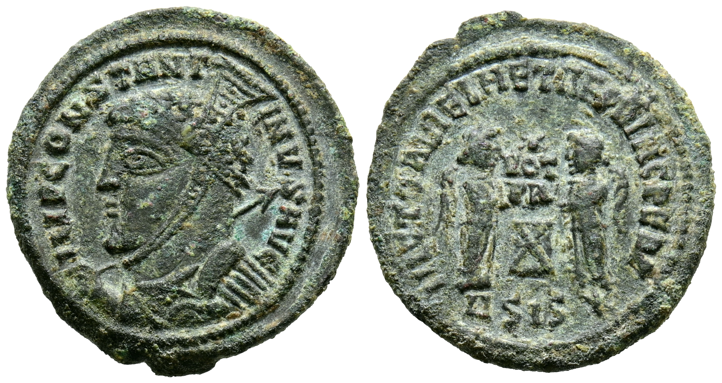 CONSTANTINO I. Follis. (Ae. 3,11g/19mm). 319 d.C. Siscia. (RIC 82) Anv: Busto de Constantino con casco de alta cimera, coraza, escudo y lanza a izquierda, alrededor leyenda: CONSTANTINVS AVG. Rev: Dos victorias sujetando sobre altar escudo con inscripción VOT/PR, en exergo: ASIS, alrededor leyenda: VICT LAETAE PRINC PERP. MBC.