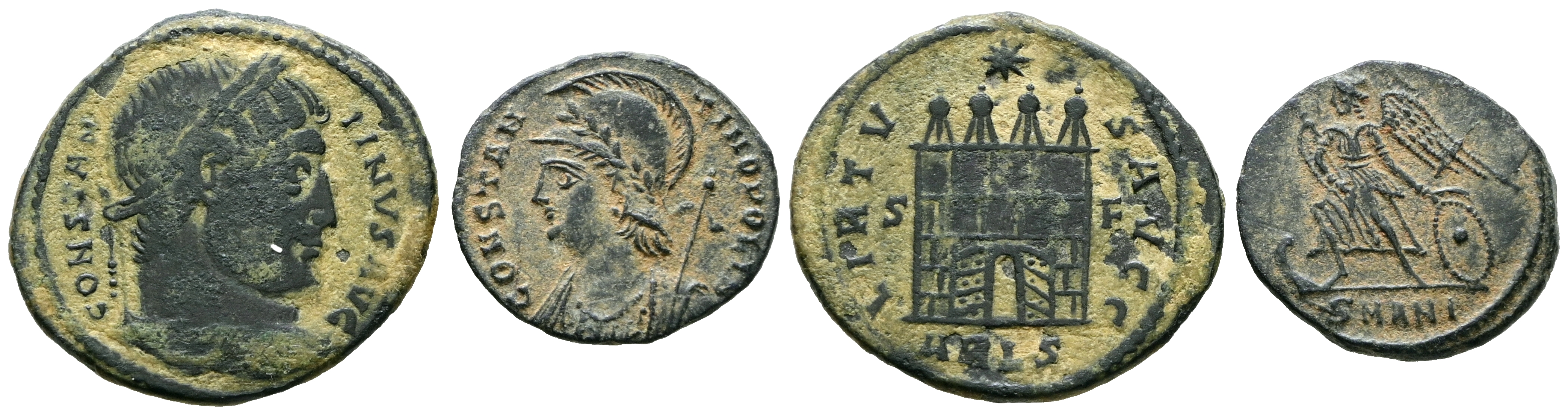 CONSTANTINO I. Interesante pareja de bronces acuñados de diferentes tipos, medidas y estados de conservación. A EXAMINAR.