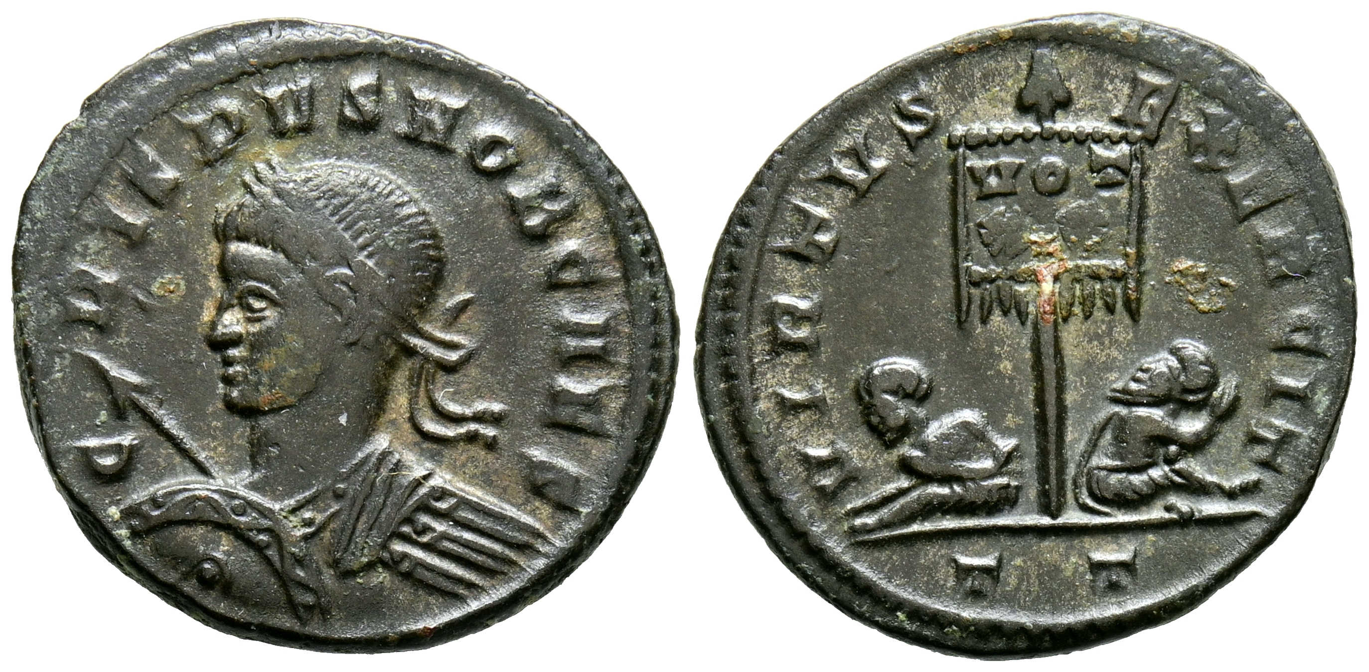 CRISPO. Follis. (Ae. 2,80g/20mm). 319-322 d.C. Ticinum. (RIC 117). Anv: Busto laureado con coraza de Crispo a izquierda portando lanza y escudo, alrededor leyenda: IVL CRISPVS NOB CAES. Rev: Dos cautivos sentados en la base de estandarte con inscripción: VOT/X, en exergo: T T, alrededor leyenda: VIRTVS EXERCIT. MBC+.