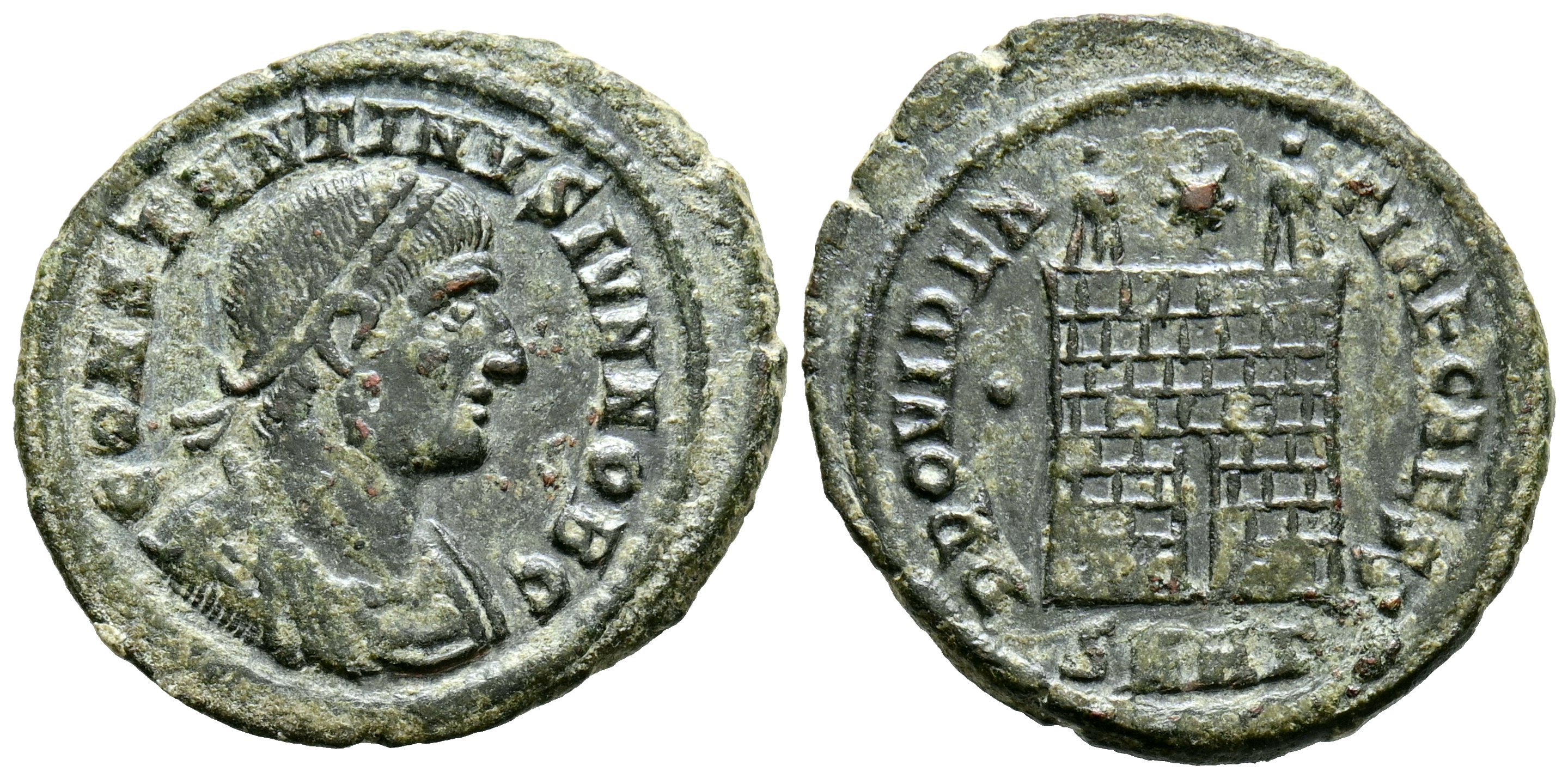 CONSTANTINO II. Follis. (Ae. 2,71g/21mm). 324-325 d.C. Heráclea. (RIC 96). Anv: Busto laureado y con coraza de Constantino II a izquierda, alrededor leyenda: CONSTANTINVS IVN NOB C. Rev: Puerta de campamento, encima estrella entre dos torretas, al lado un punto, debajo: SMHr, alrededor leyenda: PROVIDENTIAE CAESS. MBC+.