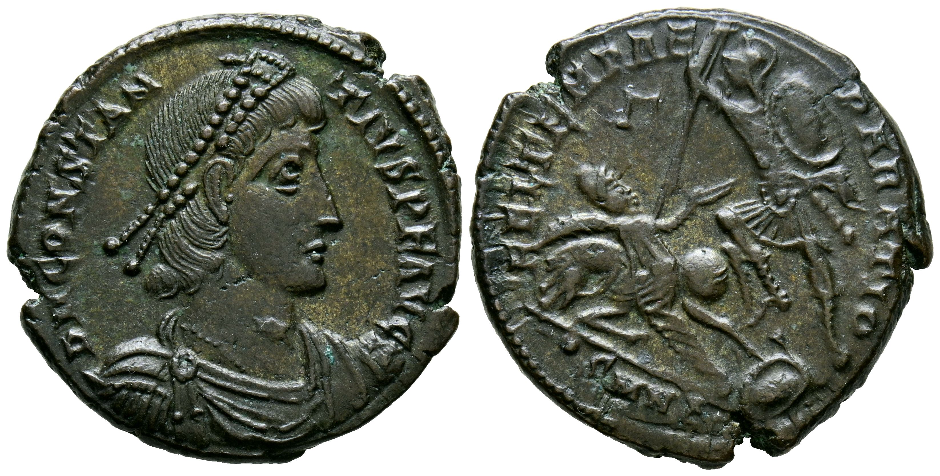 CONSTANCIO II. Follis. (Ae. 6,21g/24mm). 351-355 d.C. Nicomedia. (RIC 86). Anv: Busto diademado, drapeado y con coraza de Constancio II a derecha, alrededor leyenda: D N CONSTANTIVS P F AVG. Rev: Soldado con lanza y escudo atacando a jinete sobre caballo cayó a izquierda, en campo r, en exergo: SMNA, alrededor leyenda: FEL TEMP REPARATIO. MBC+.