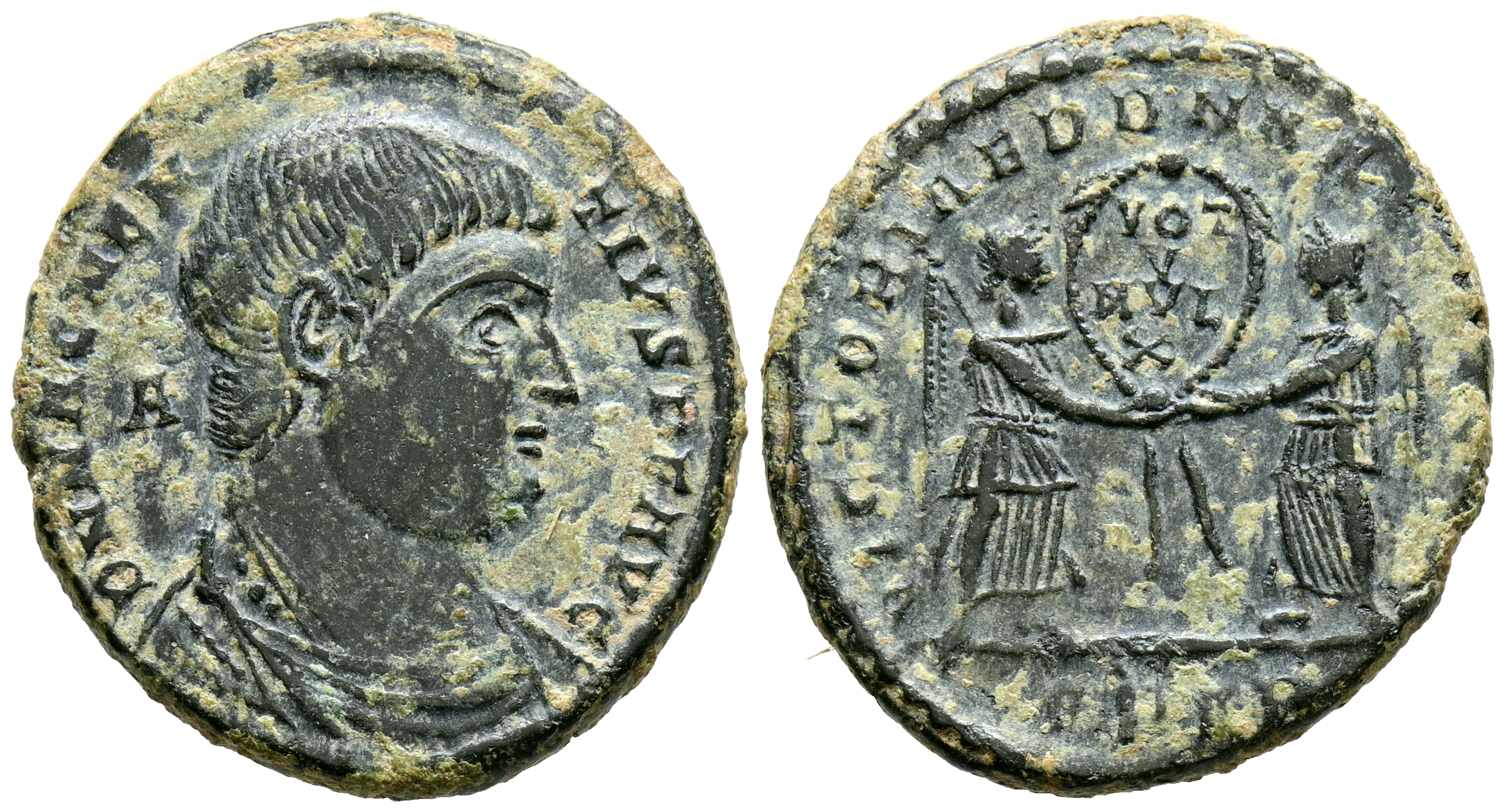 MAGNENCIO. Centenional. (Ae. 5,77g/24mm). 351-352 d.C. Arelate. (RIC 164). Anv: Busto drapeado y con coraza de Magnencio a derecha, detrás: A, alrededor leyenda: D N MAGNENTIVS P F AVG. Rev: Dos Victorias enfrentadas portando escudo con inscripción: VOT /V/MVLT/X, en exergo: FPAR, alrededor leyenda: VICT DD NN AVG ET CAES. MBC.