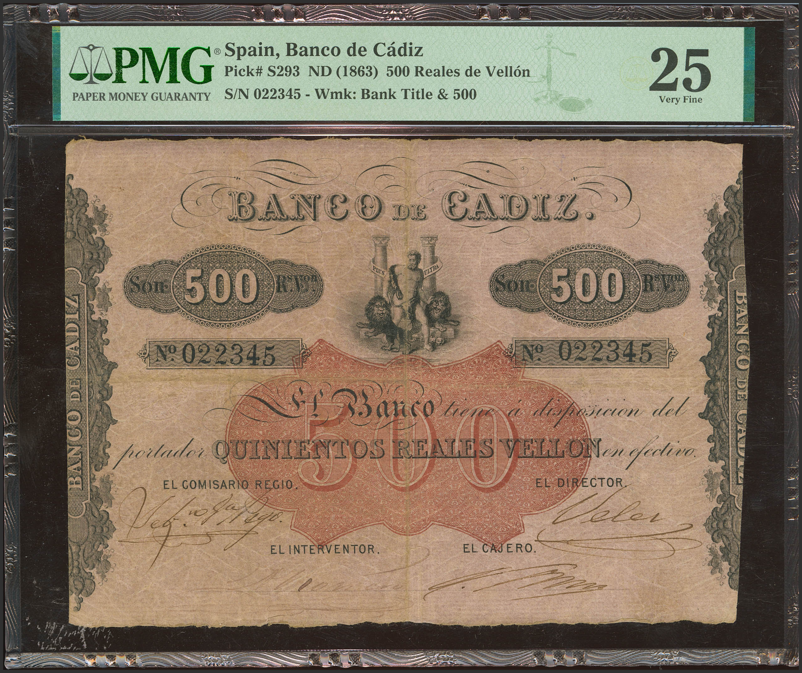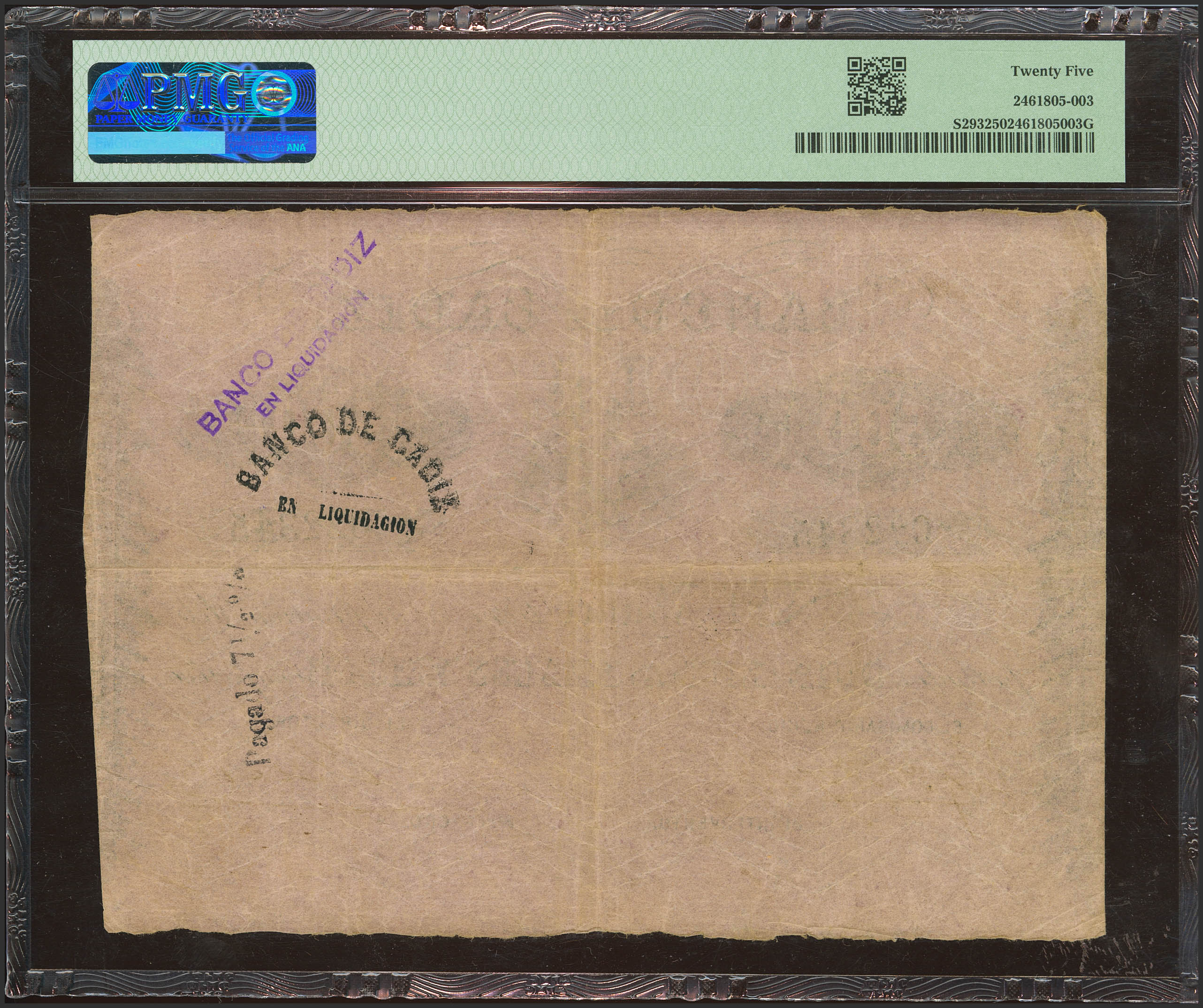 BANCO DE CADIZ. Emisión III. 500 Reales. (Sin fechar). Sin serie. (Edifil 2023: 80, Pick: S293). MBC+. Encapsulado PMG25.