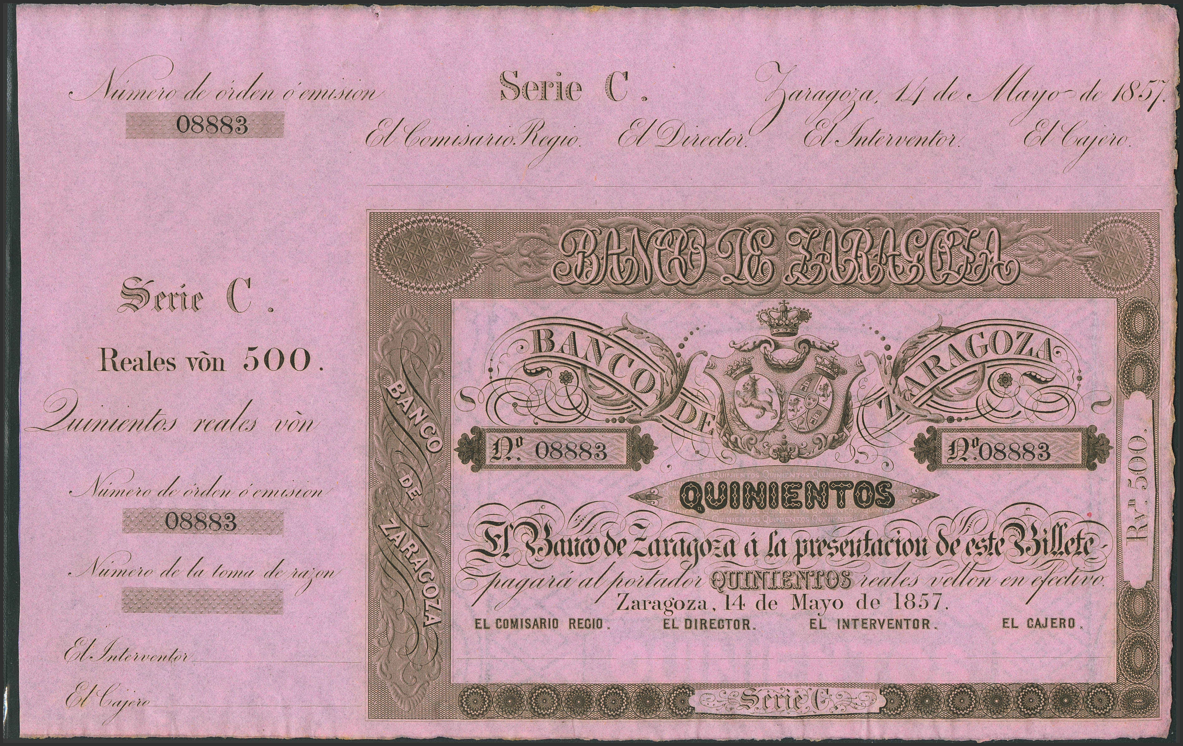 500 Reales de Vellón. 14 de Mayo de 1857. Banco de Zaragoza. Serie C y con matriz. (Edifil 2023: 128B). Apresto original. SC-.