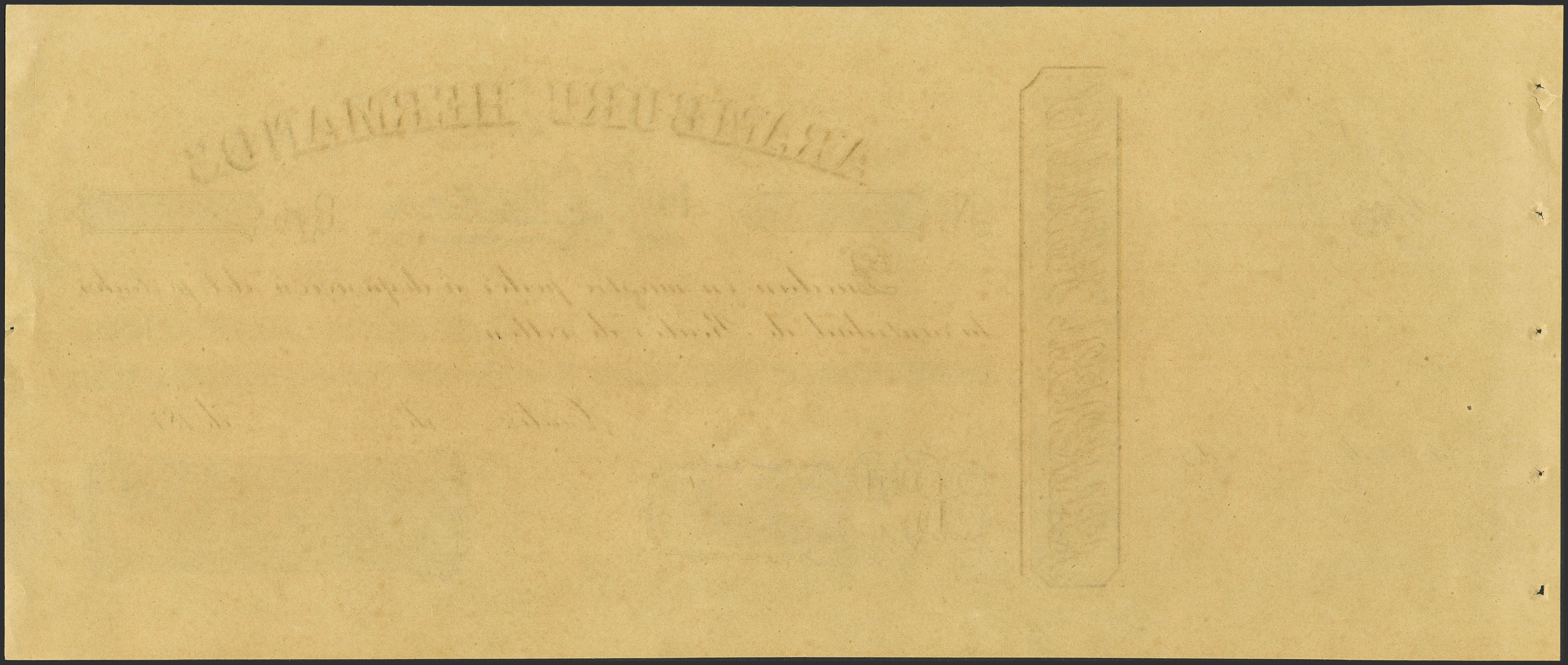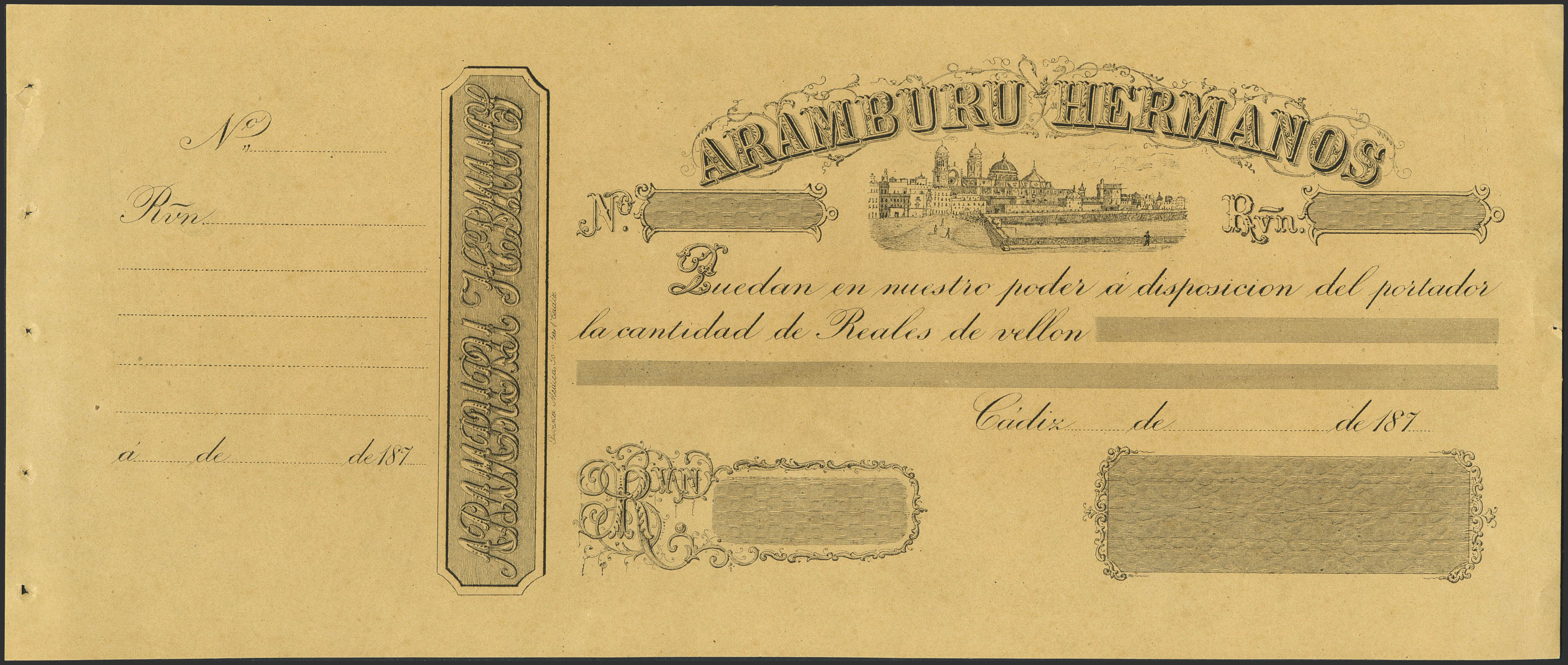 (187_ca). Aramburu Hermanos, Cádiz (Recibo). Para entender mejor la contextualización de este Banco recomendamos la obra "Obligaciones, vales y documentos puestos en circulación como papel moneda en España", de Don Ramón Cobo Huici. SC--.