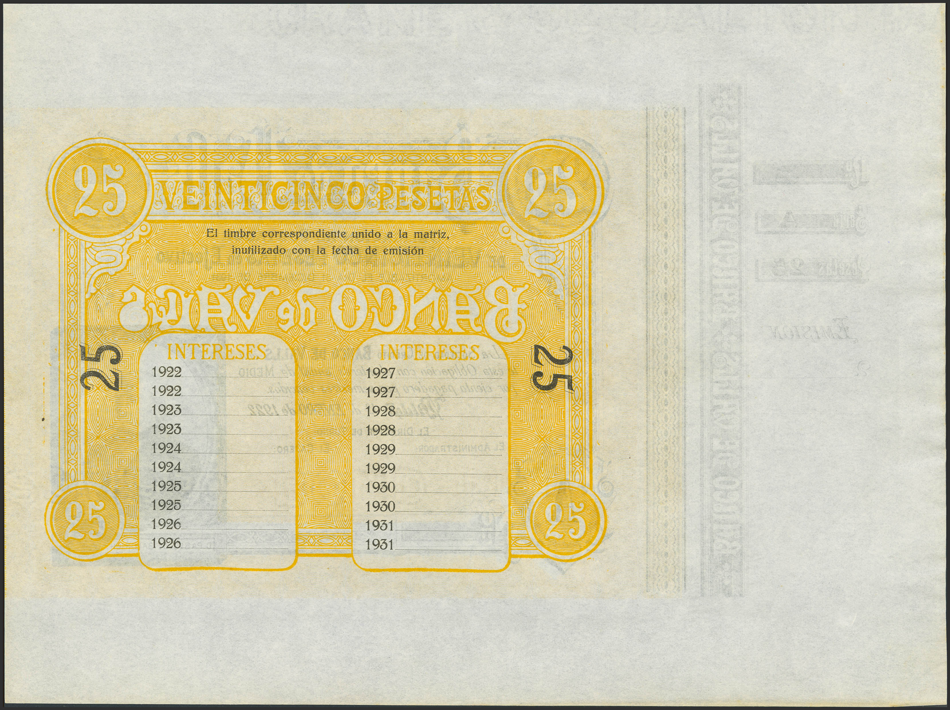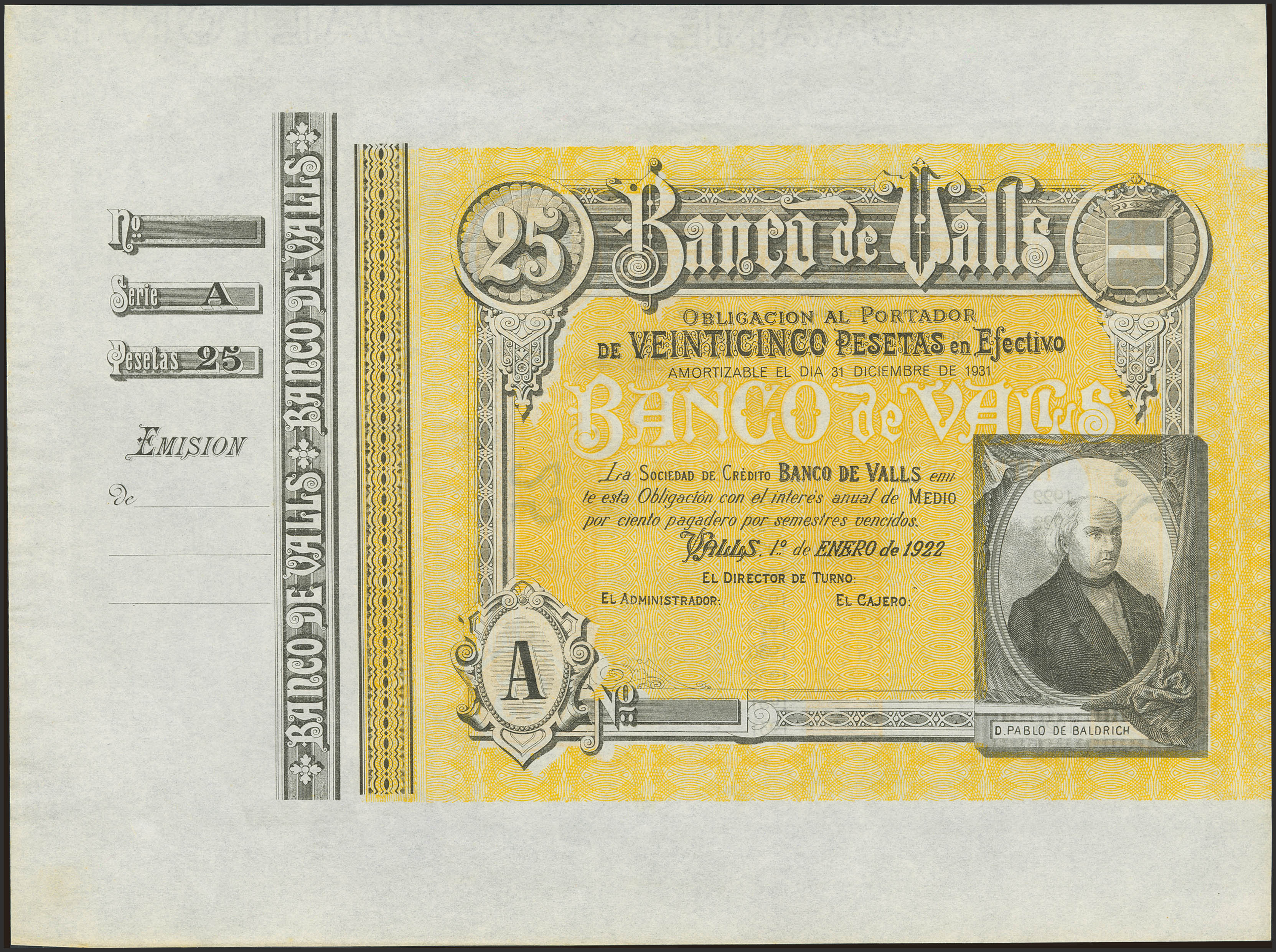 25 Pesetas. 1 de Enero de 1922. Banco de Valls. Sin numeración, sin firmas y con matriz. Serie A. (Ruiz y Alentorn: 935). SC-.