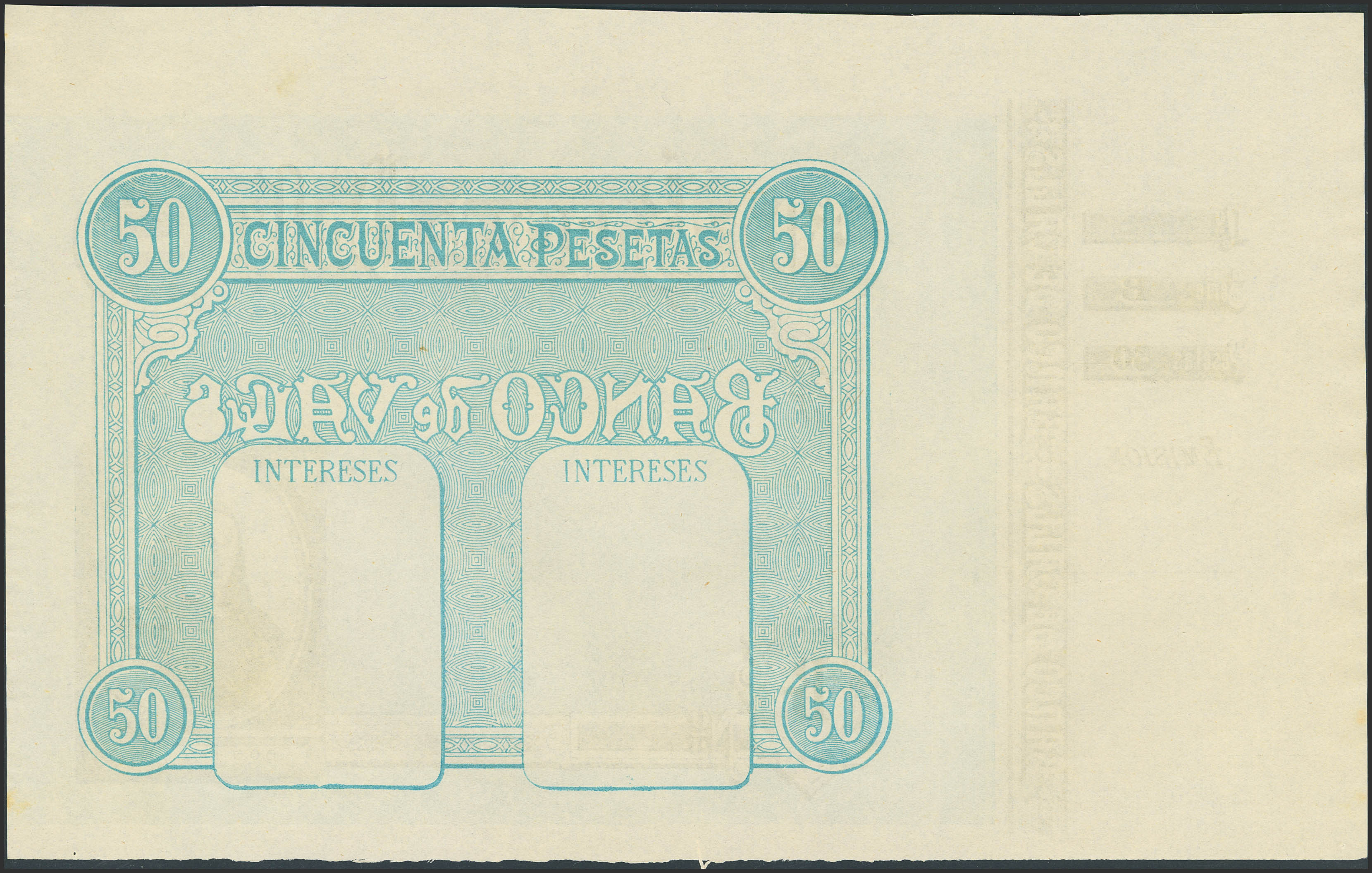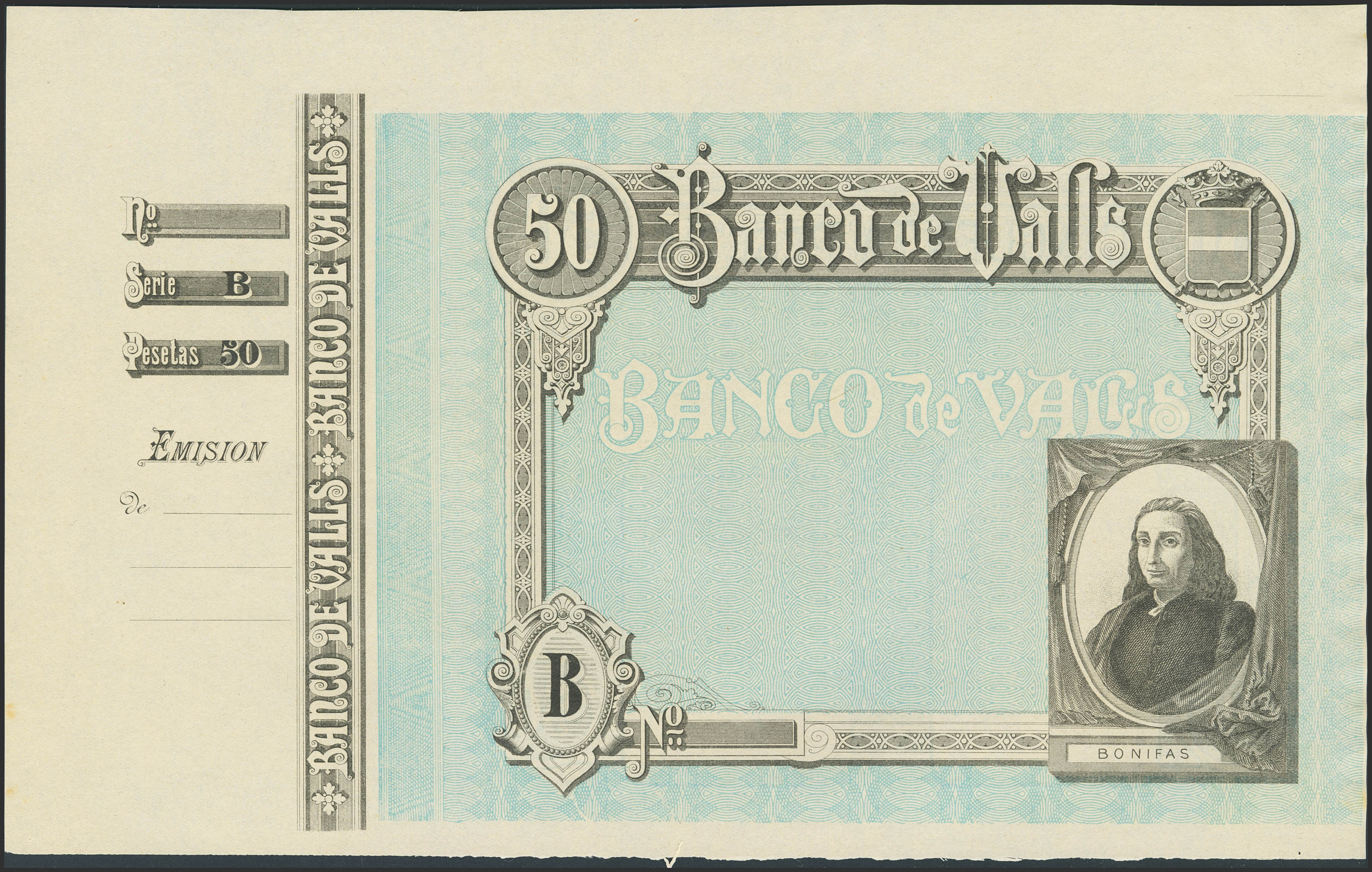 50 Pesetas. (1892ca). Banco de Valls. Prueba de impresión, con matriz a la izquierda y sin texto. Serie B. (Ruíz y Alentorn: 931). SC.
