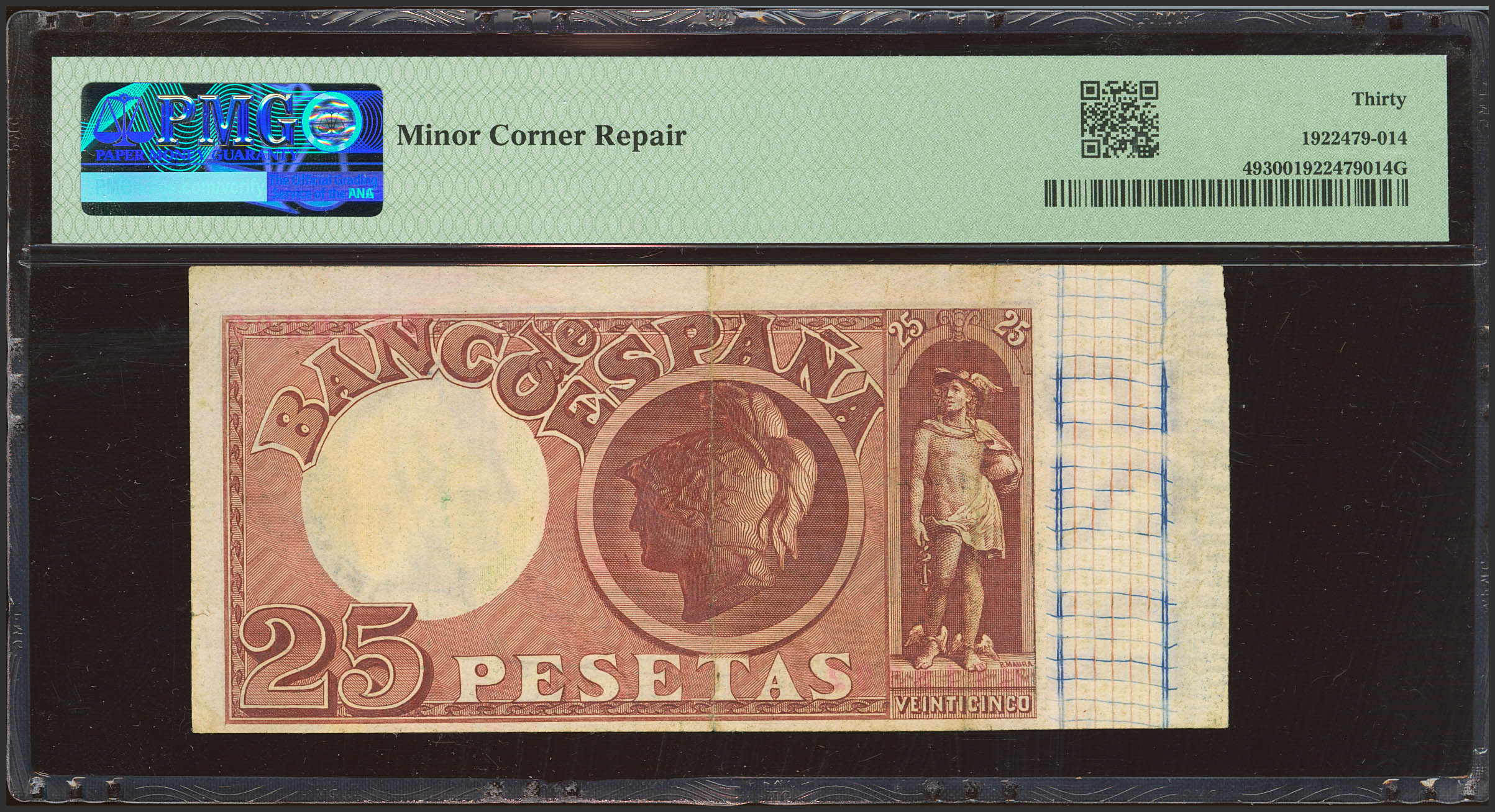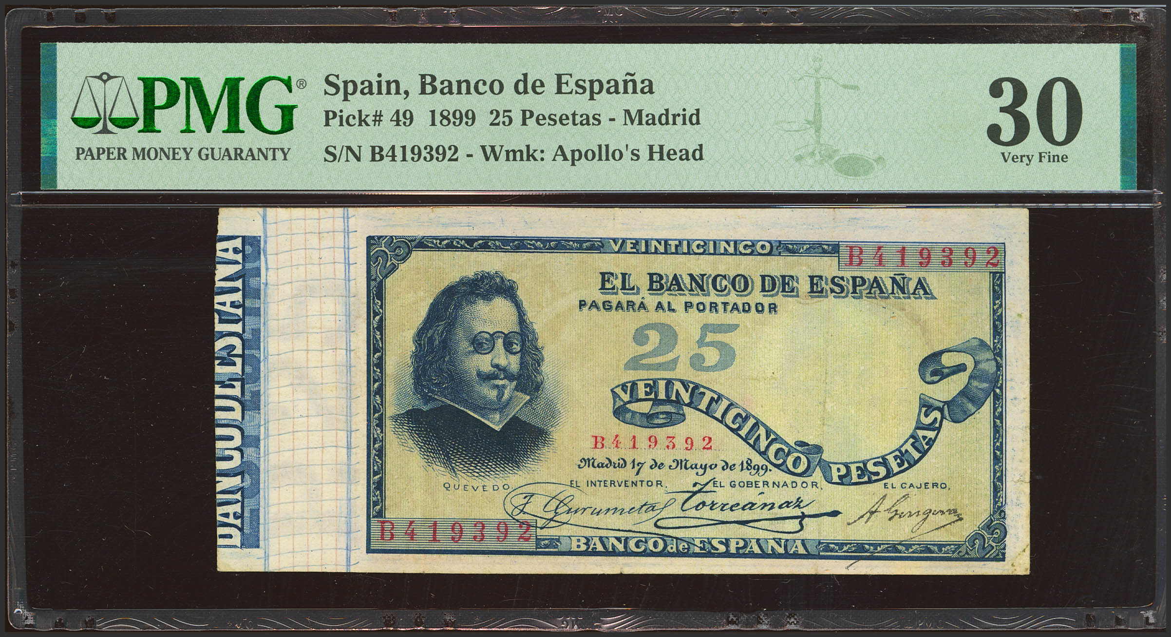 25 Pesetas. 17 de Mayo de 1899. Serie B. (Edifil 2023: 306a, Pick: 49). Raro, esquina inferior derecha mínimamente reparada. MBC+. Encapsulado PMG35 (minor corner repair).