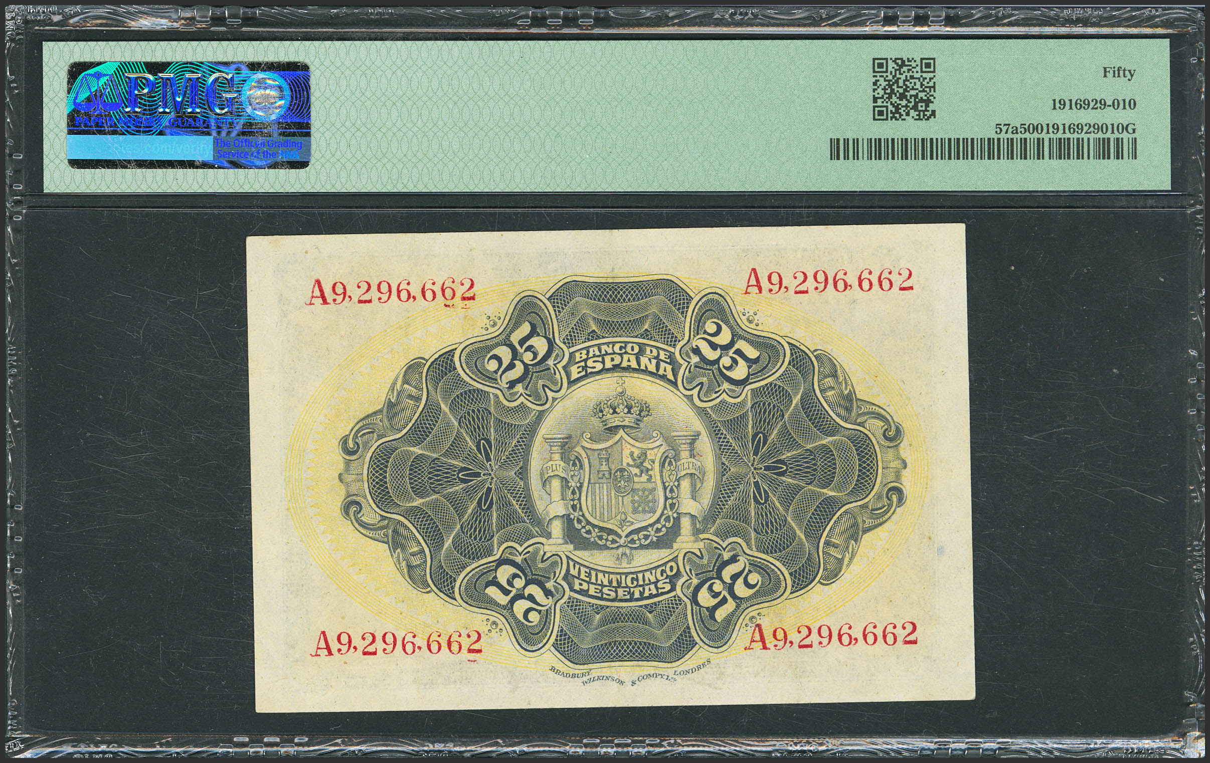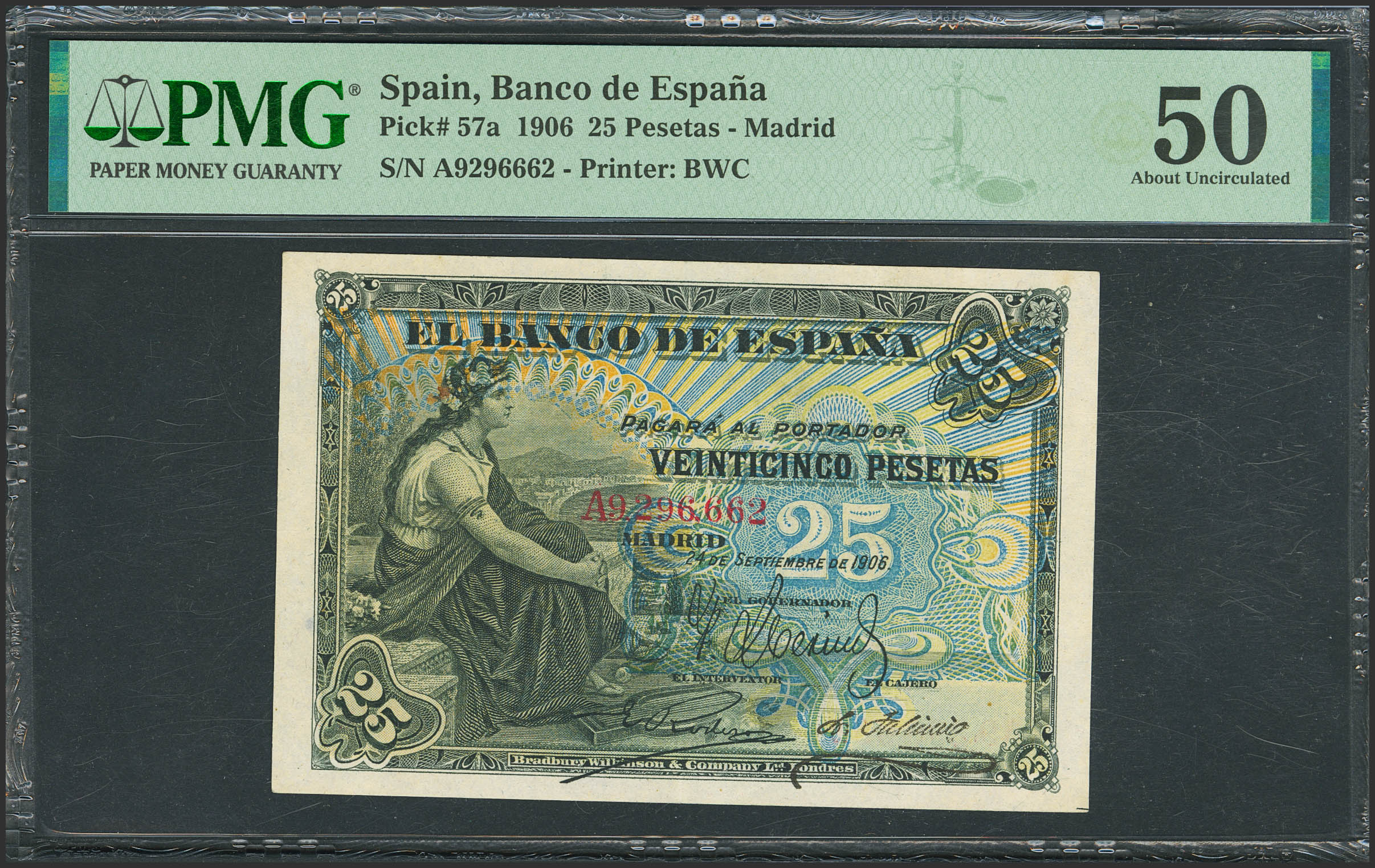 25 Pesetas. 24 de Septiembre de 1906. Serie A. (Edifil 2023: 314a, Pick: 57a). Inusual en esta calidad. EBC. Encapsulado PMG50.