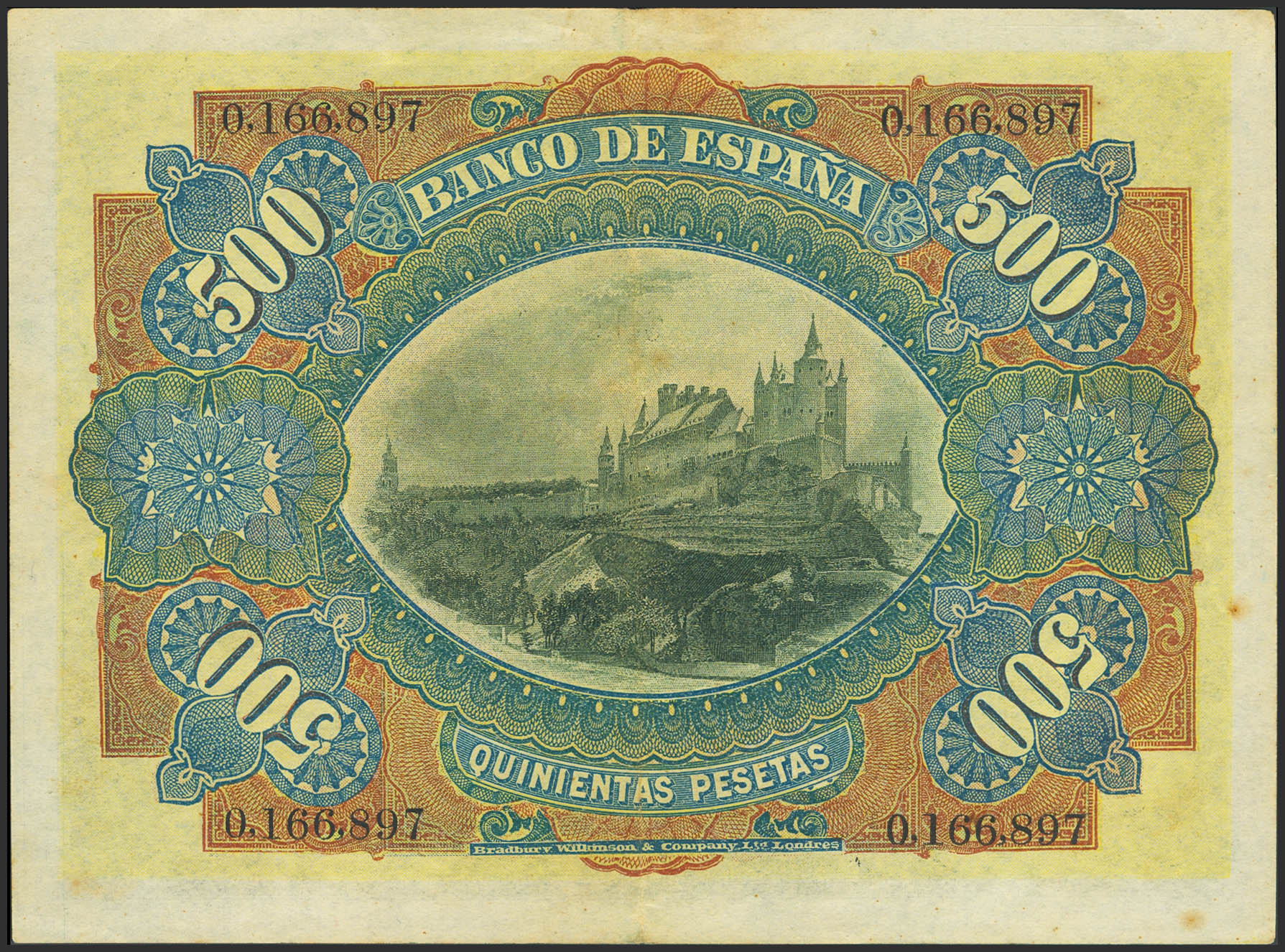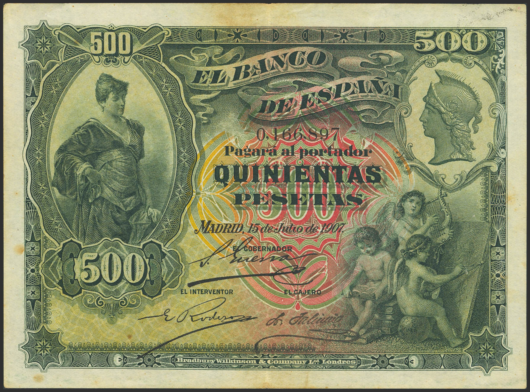 500 Pesetas. 15 de Julio de 1907. Sin serie. (Edifil 2023: 321). Inusual especialmente sin reparaciones, sombras del tiempo. MBC.