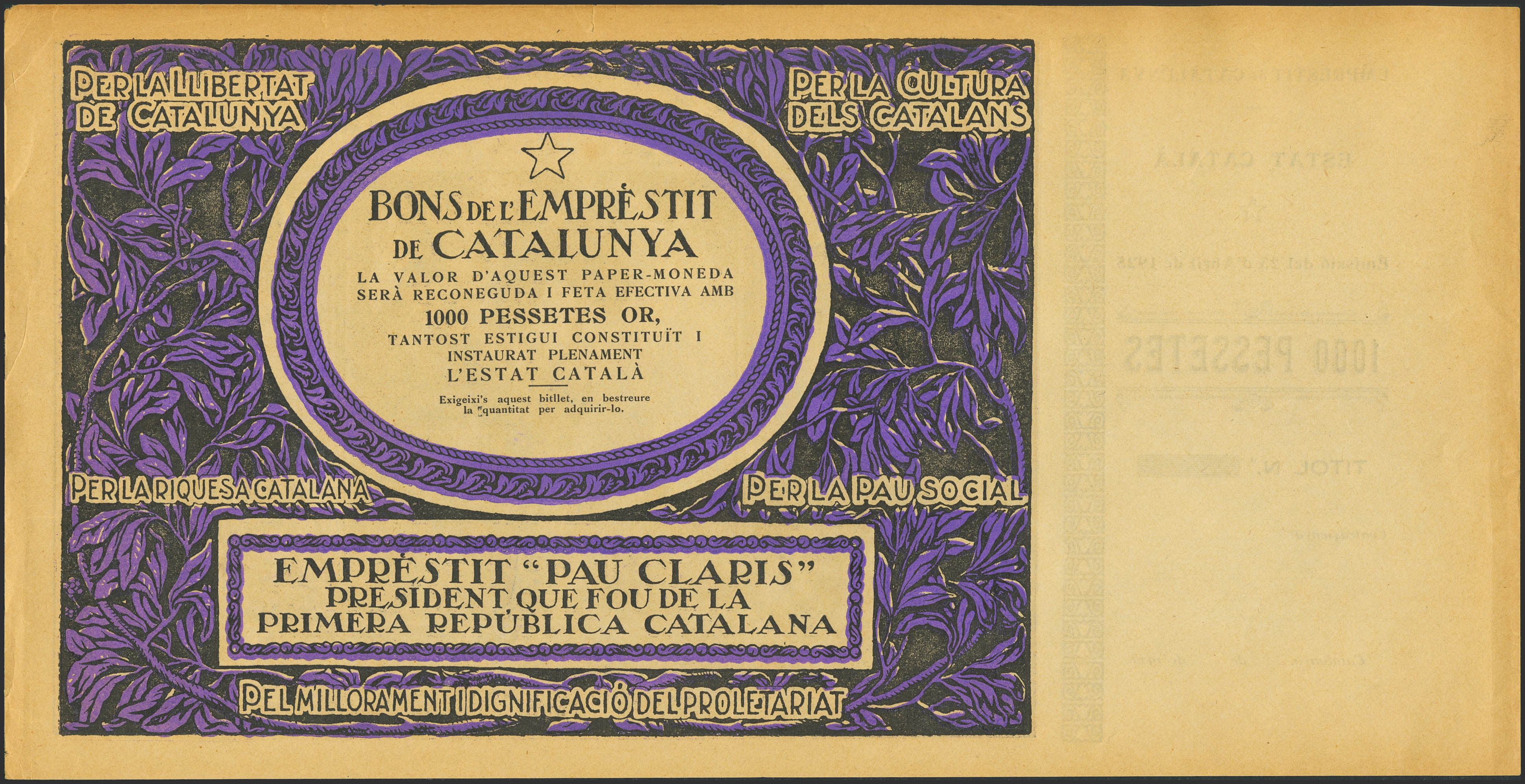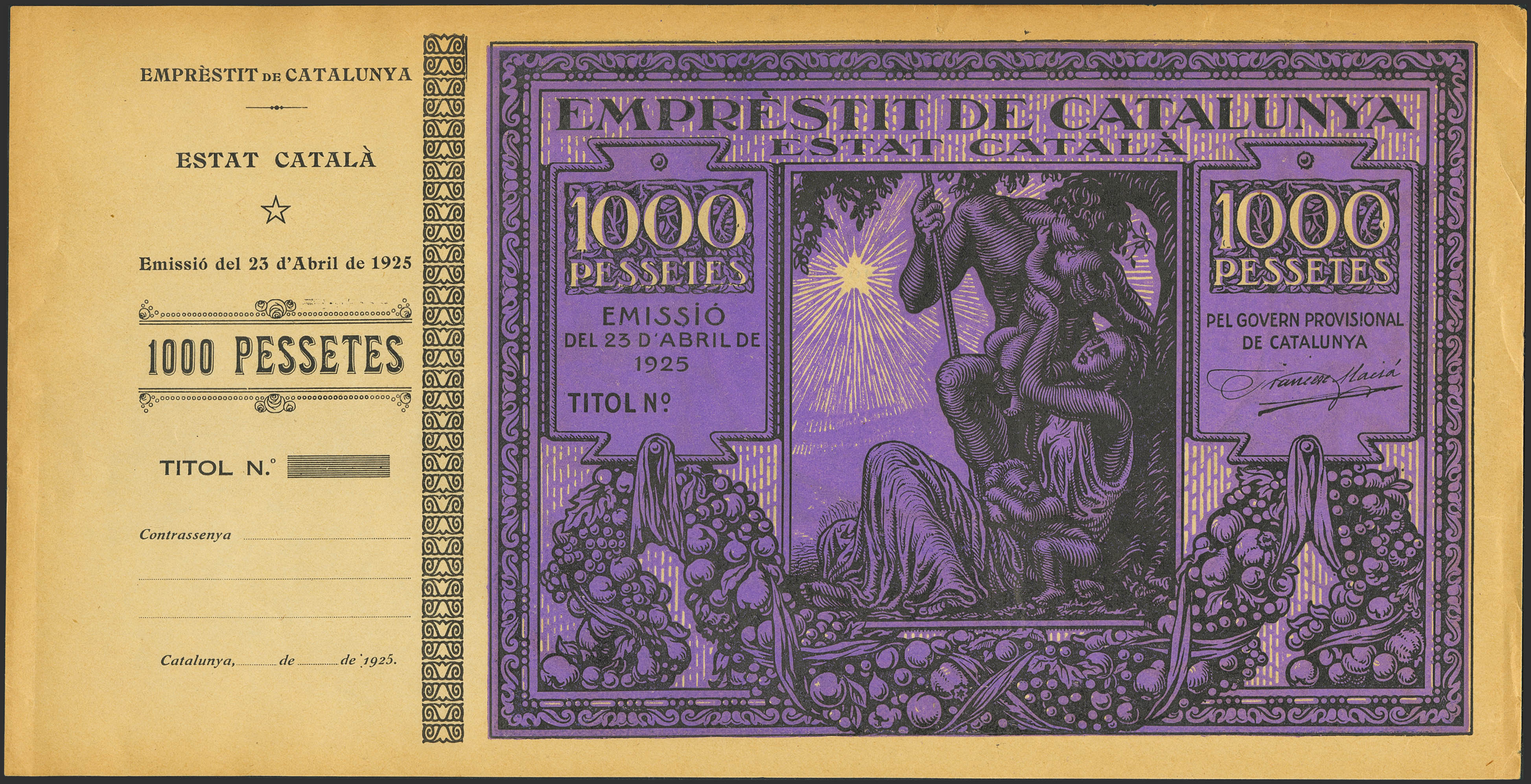 EMPRESTIT DE CATALUNYA. ESTAT CATALA. 23 de Abril de 1925. Emprestits Pau Clarís. Prueba de anverso y reverso del billete de 1000 Pessetes. Pequeñas roturitas en el margen. SC--.