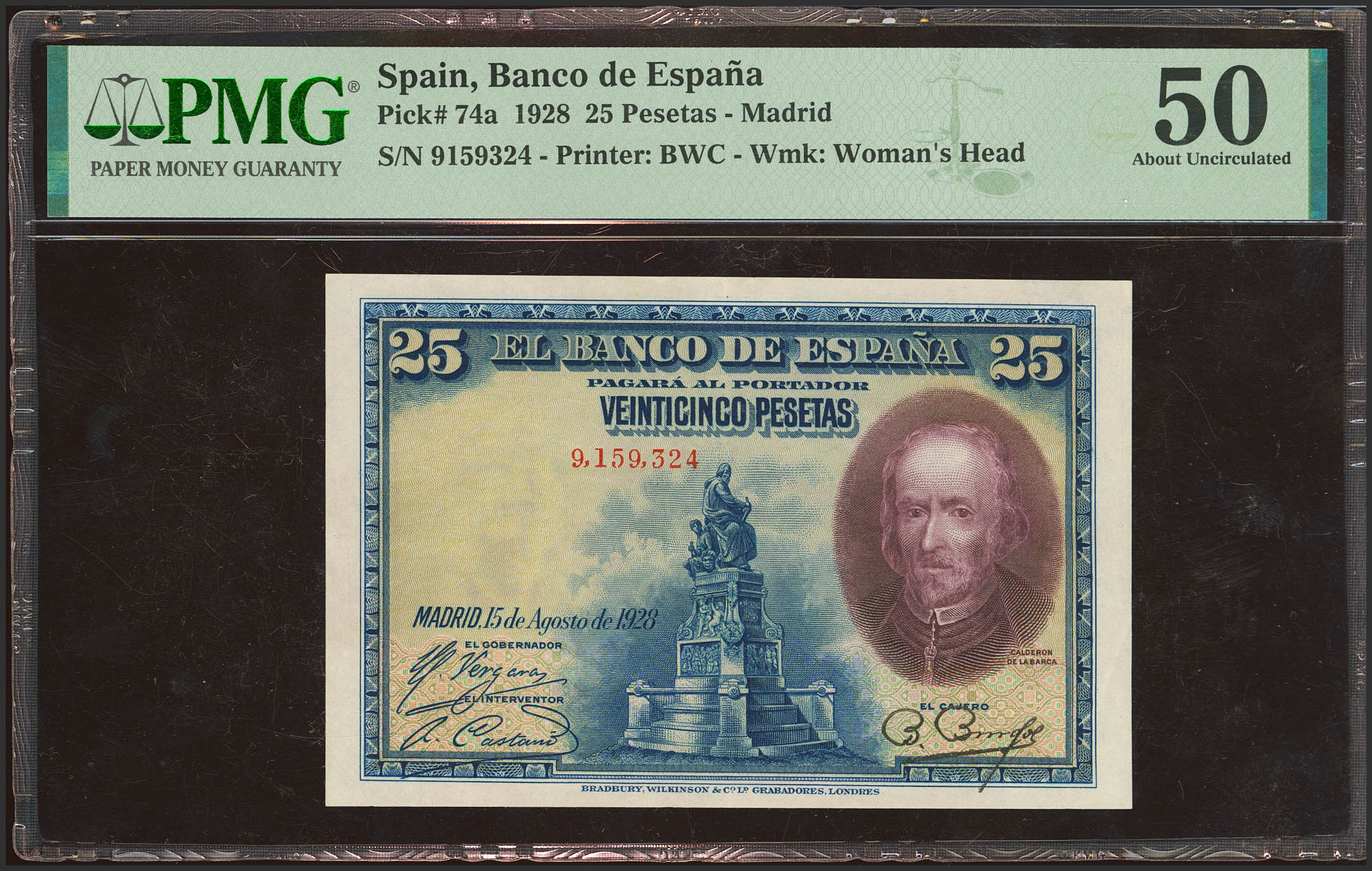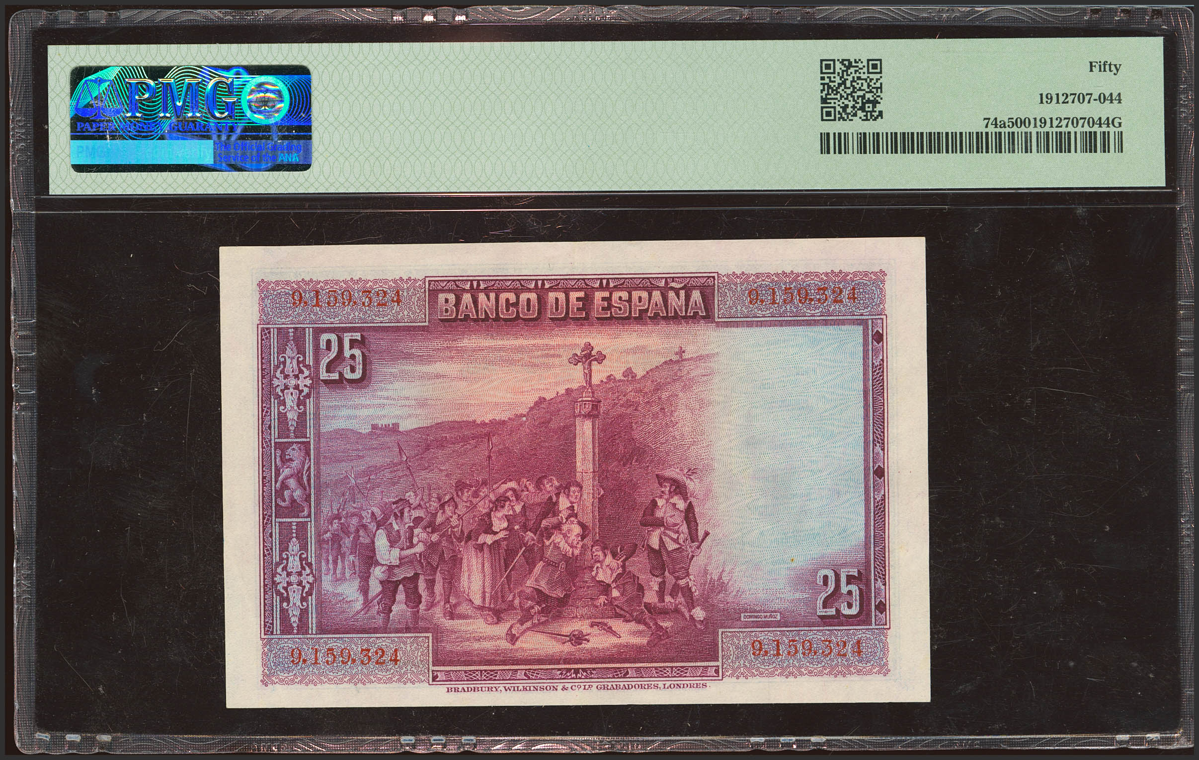 25 Pesetas. 15 de Agosto de 1928. Sin serie. (Edifil 2023: 328, Pick: 74a). EBC. Encapsulado PMG50.