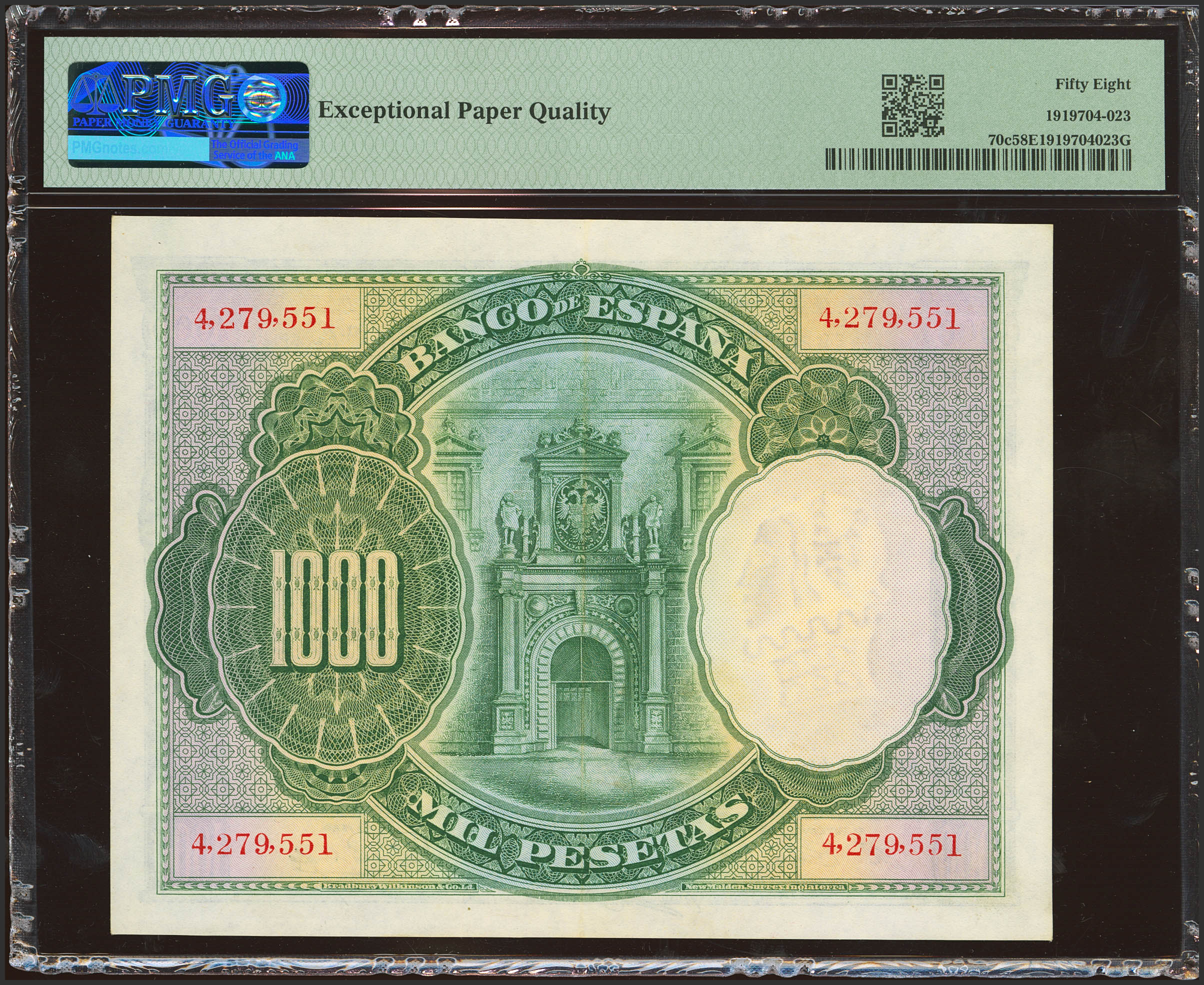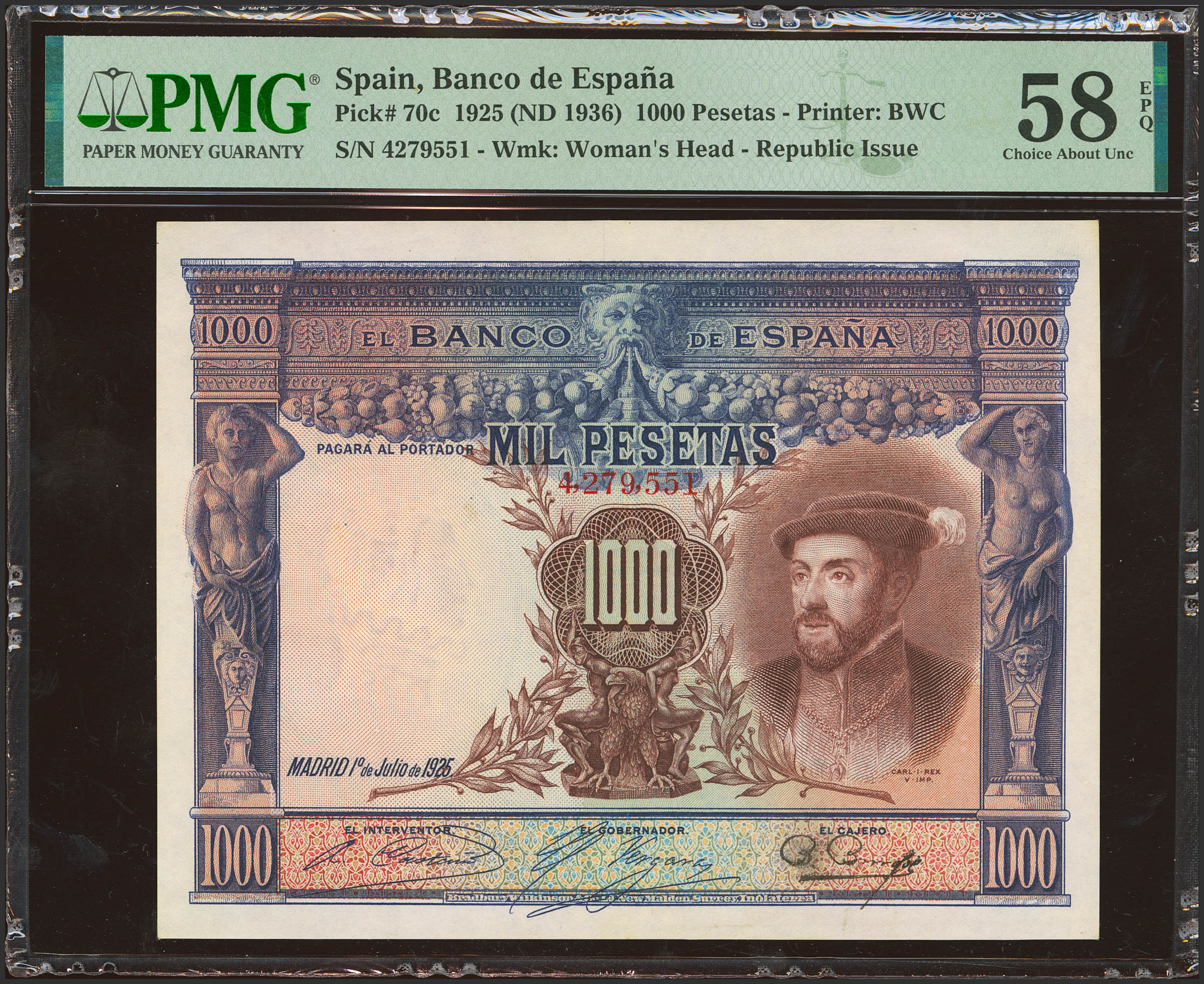 1000 Pesetas. 1 de Julio de 1925. Sin serie y numeración superior al 3646000. (Edifil 2023: 351, Pick: 70c). Inusual en esta calidad, apresto original. EBC+++. Encapsulado PMG58EPQ.