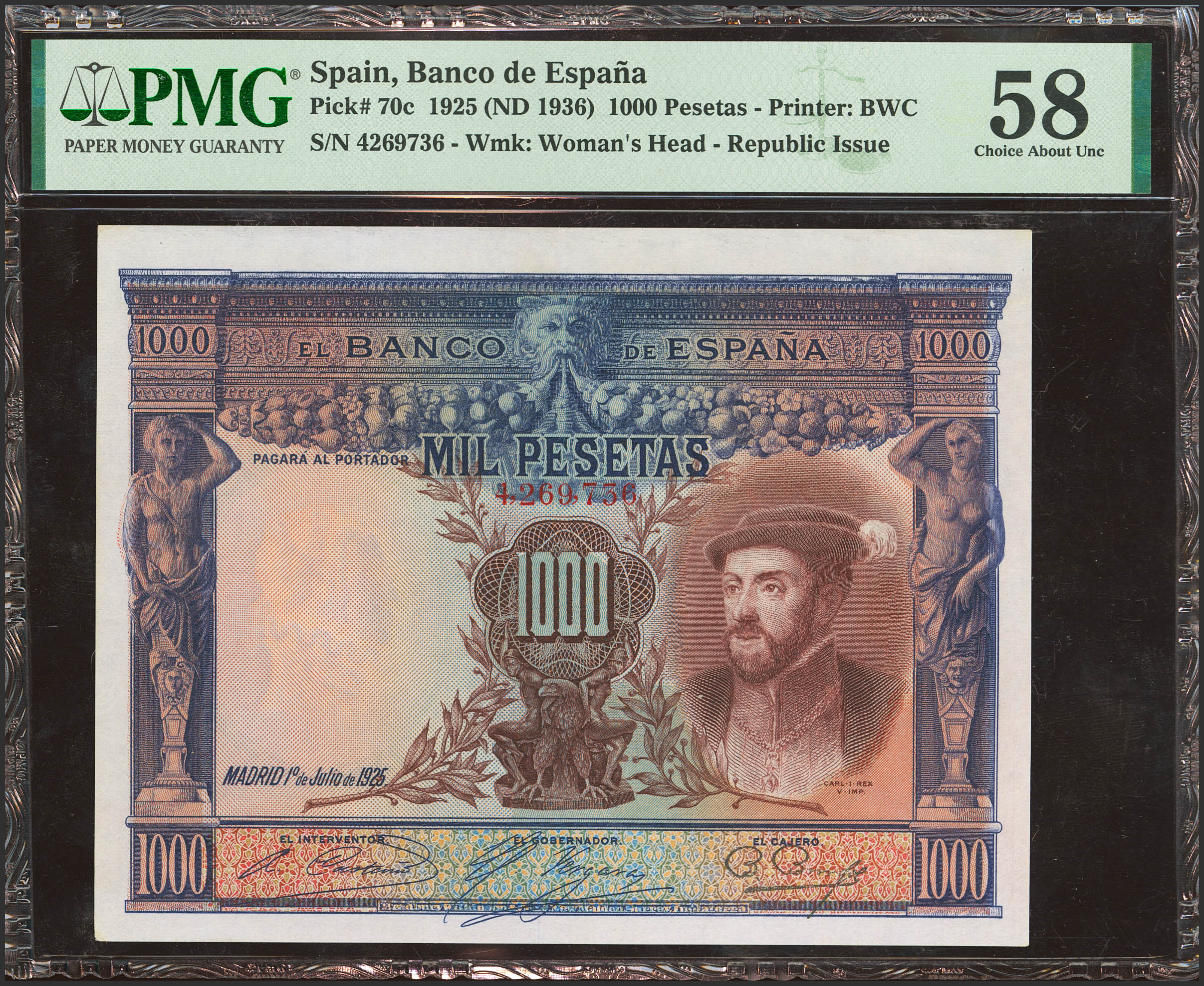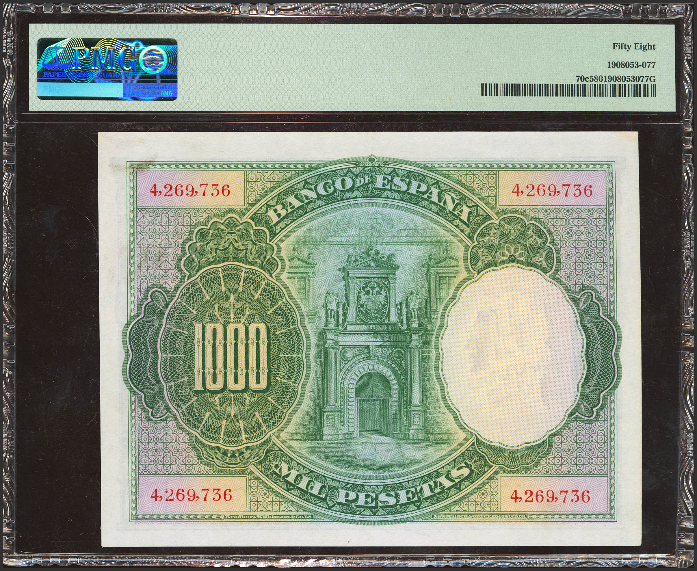 1000 Pesetas. 1 de Julio de 1925. Sin serie y numeración posterior al 3646000. (Edifil 2023: 351, Pick: 70c). EBC++. Encapsulado PMG58.