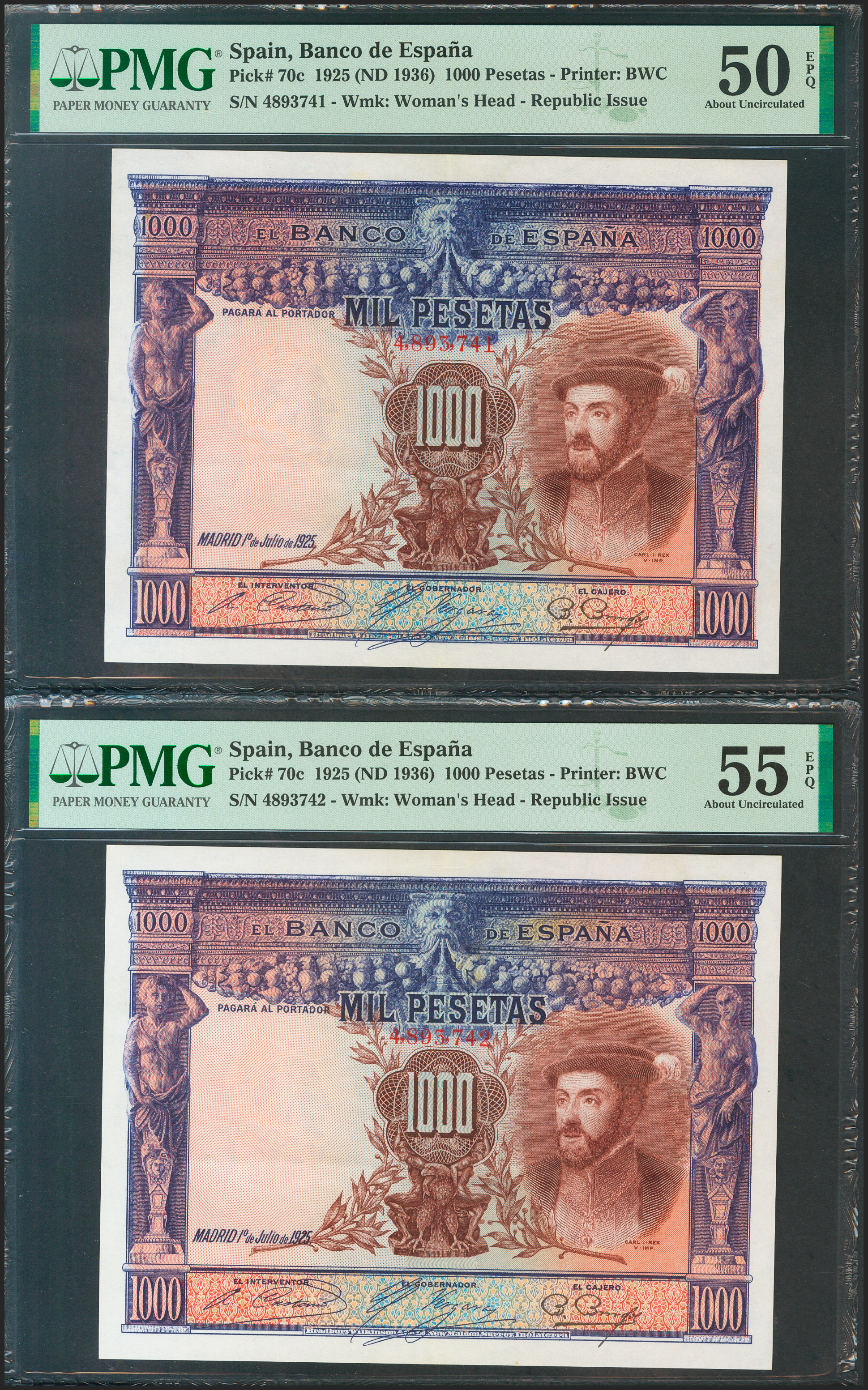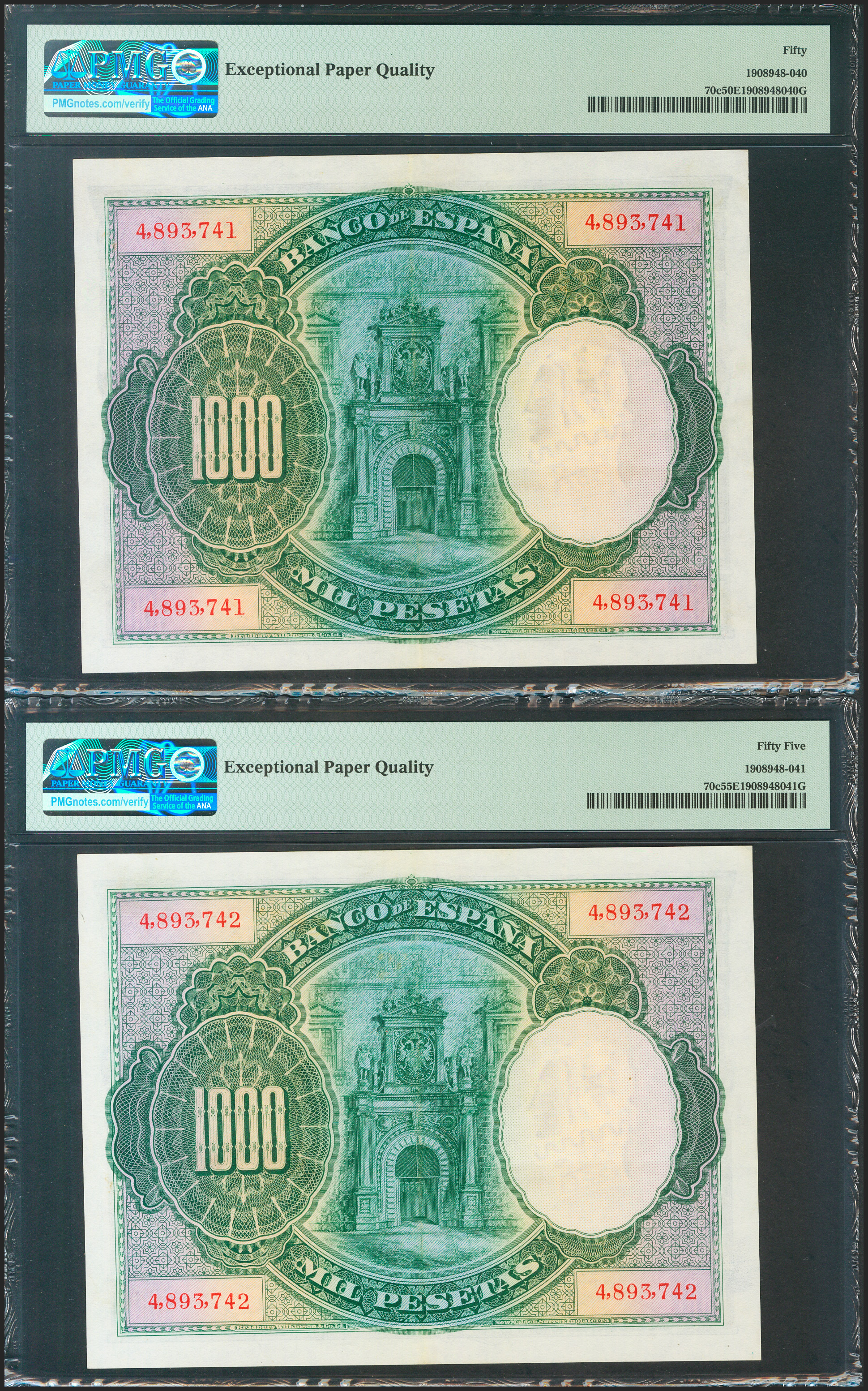 1000 Pesetas. 1 de Julio de 1925. Pareja correlativa. Sin serie y numeración posterior al 3646000. (Edifil 2021: 351, Pick: 70c). Inusual en esta calidad. EBC+. Encapsulado PMG55EPQ/50EPQ.