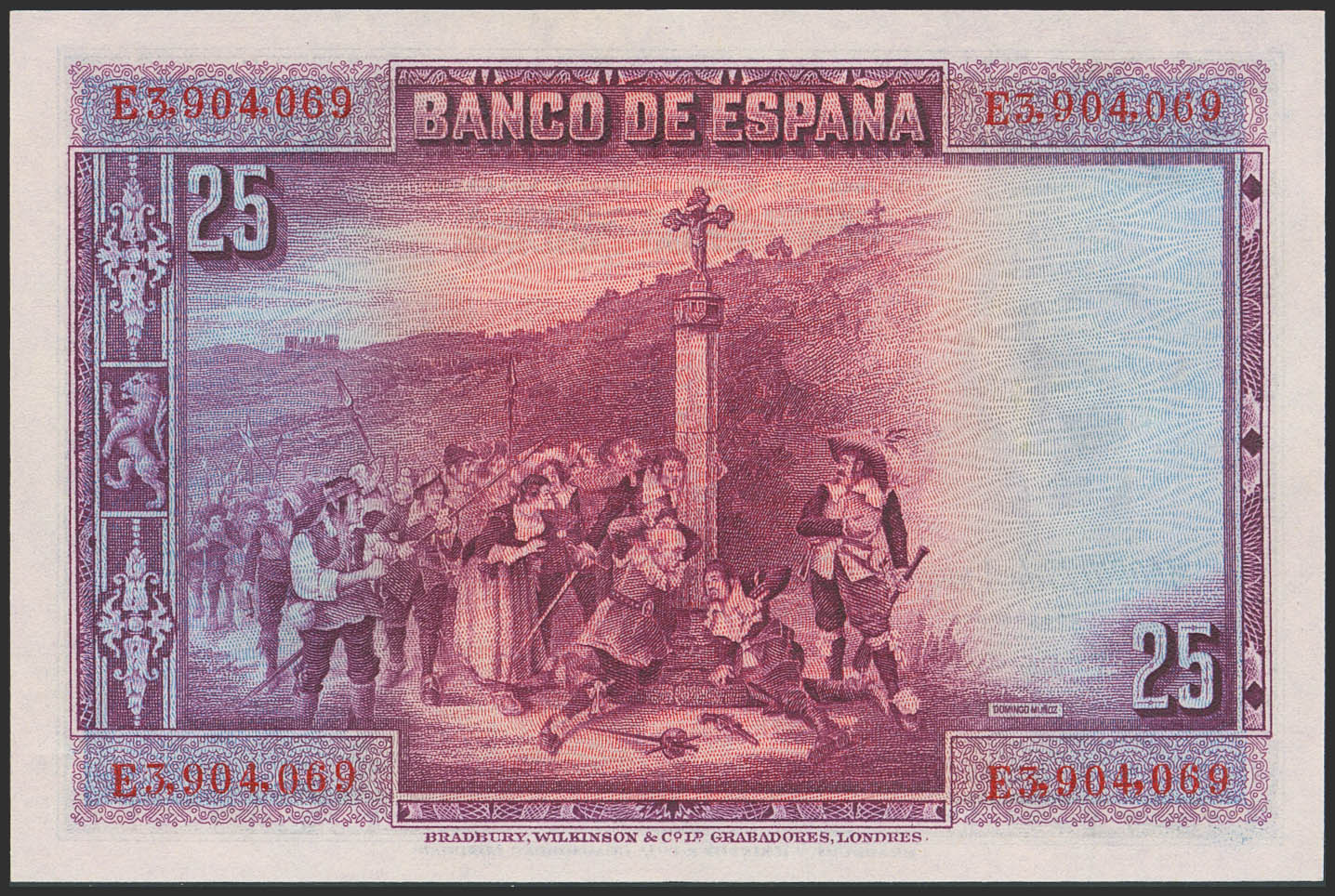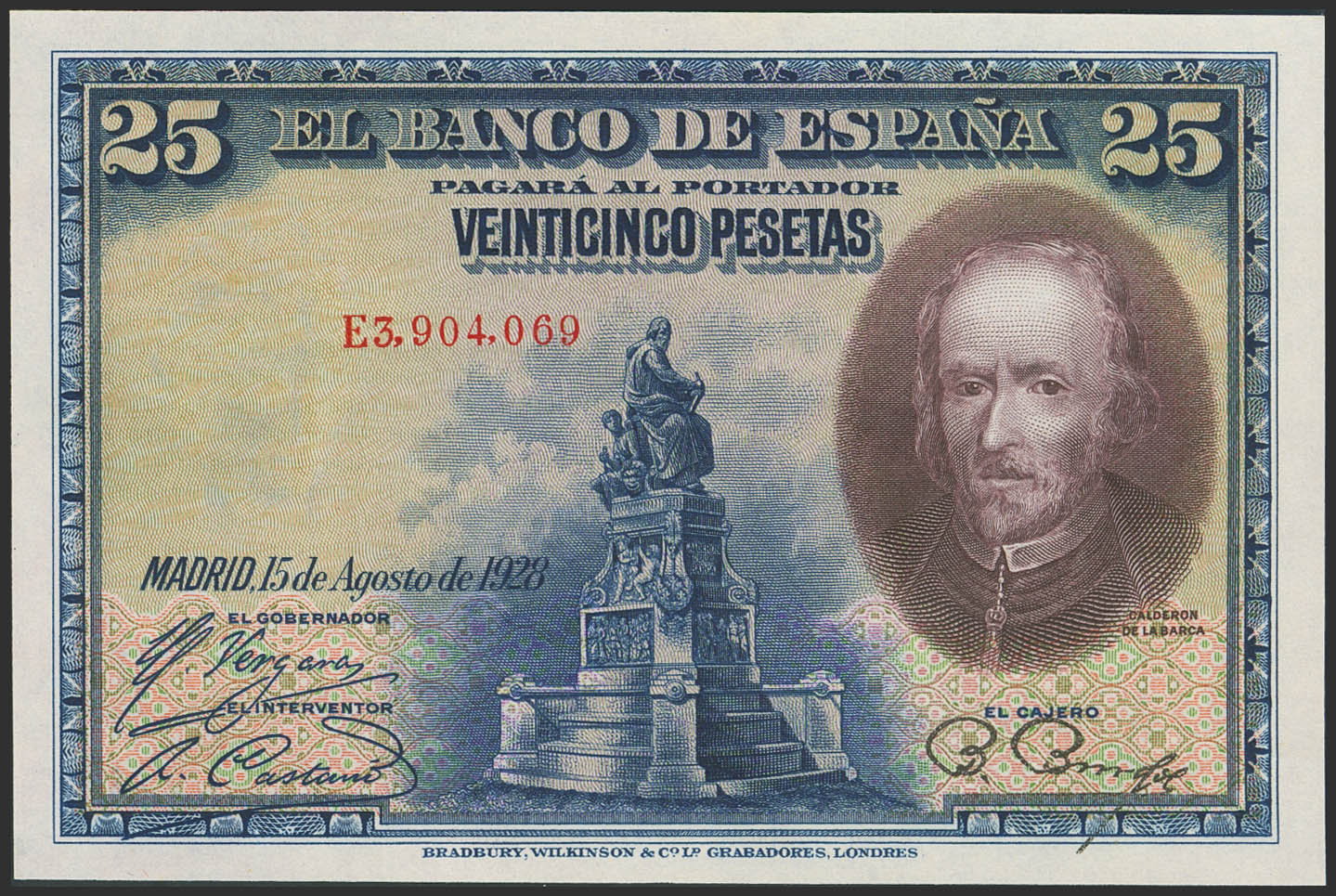 25 Pesetas. 15 de Agosto de 1928. Serie E. (Edifil 2023: 353). Apresto original. SC.