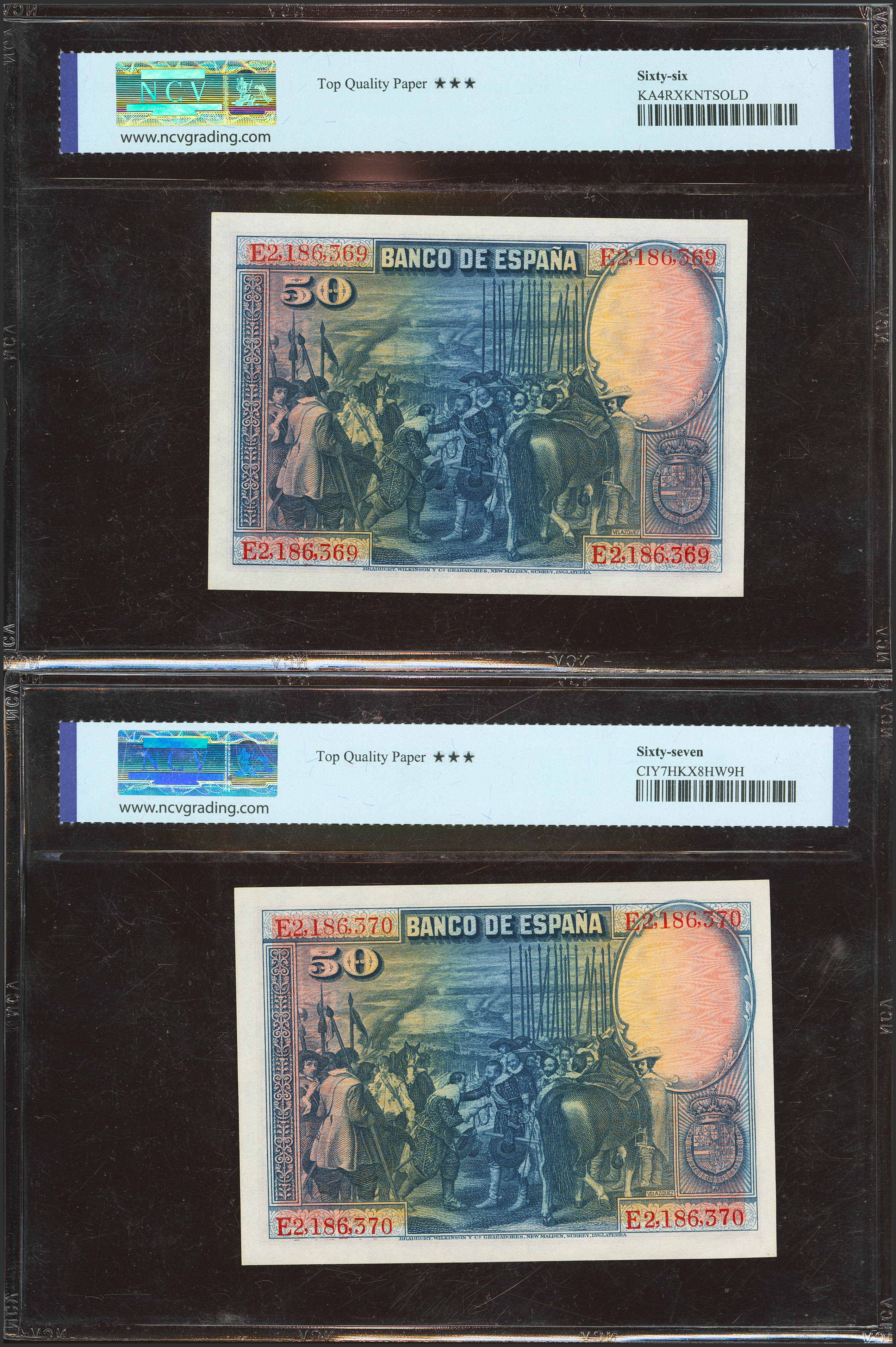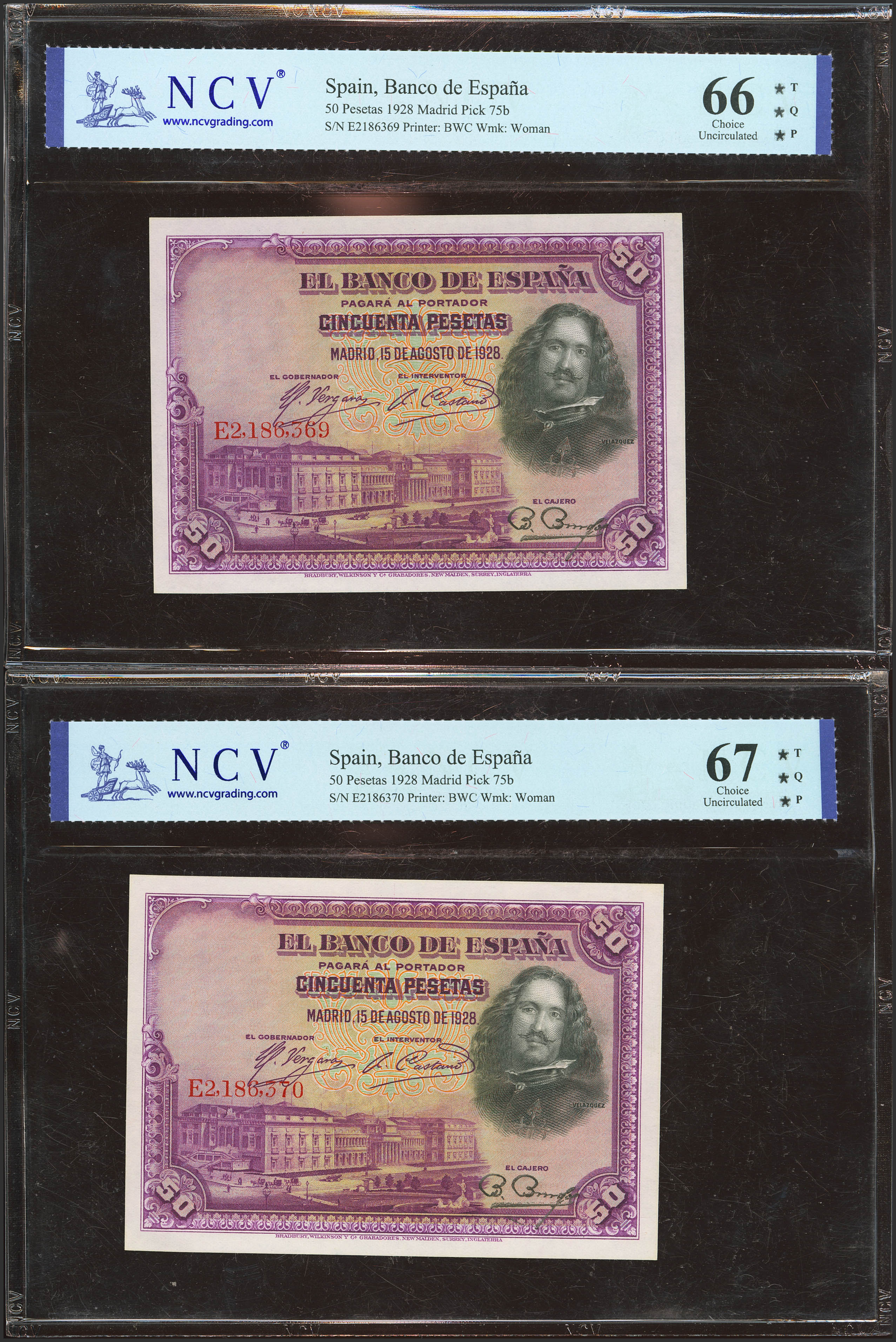 50 Pesetas. 15 de Agosto de 1928. Pareja correlativa. Serie E. (Edifil 2023: 354, Pick: 75b). Apresto original. SC. Encapsulados NCV66TQP/67TQP.
